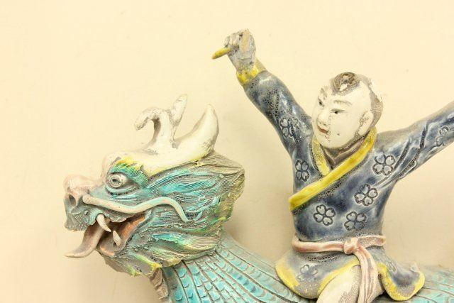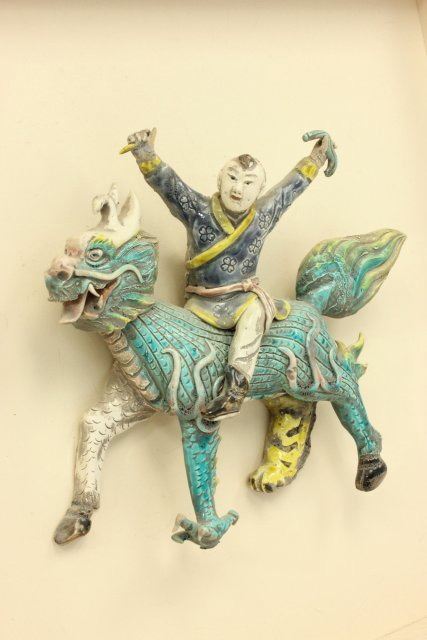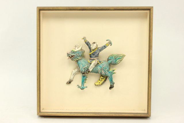 Depicting man riding on foo dog. Approx. 8 1/2" H x 9" W, 17 3/4" H x 18 3/4" W framed.