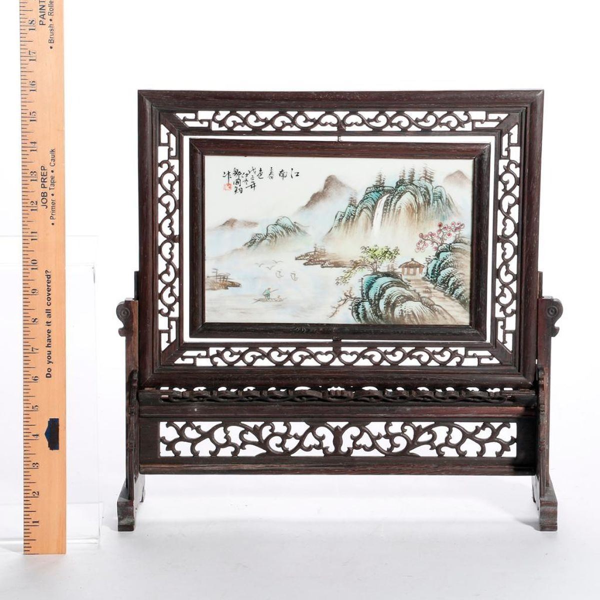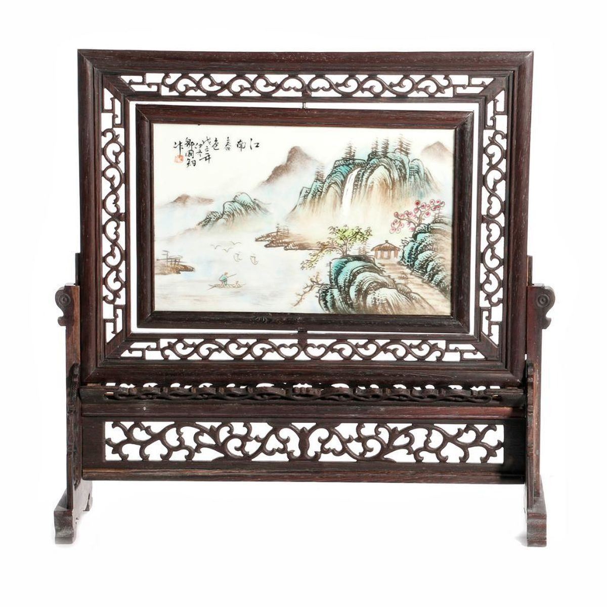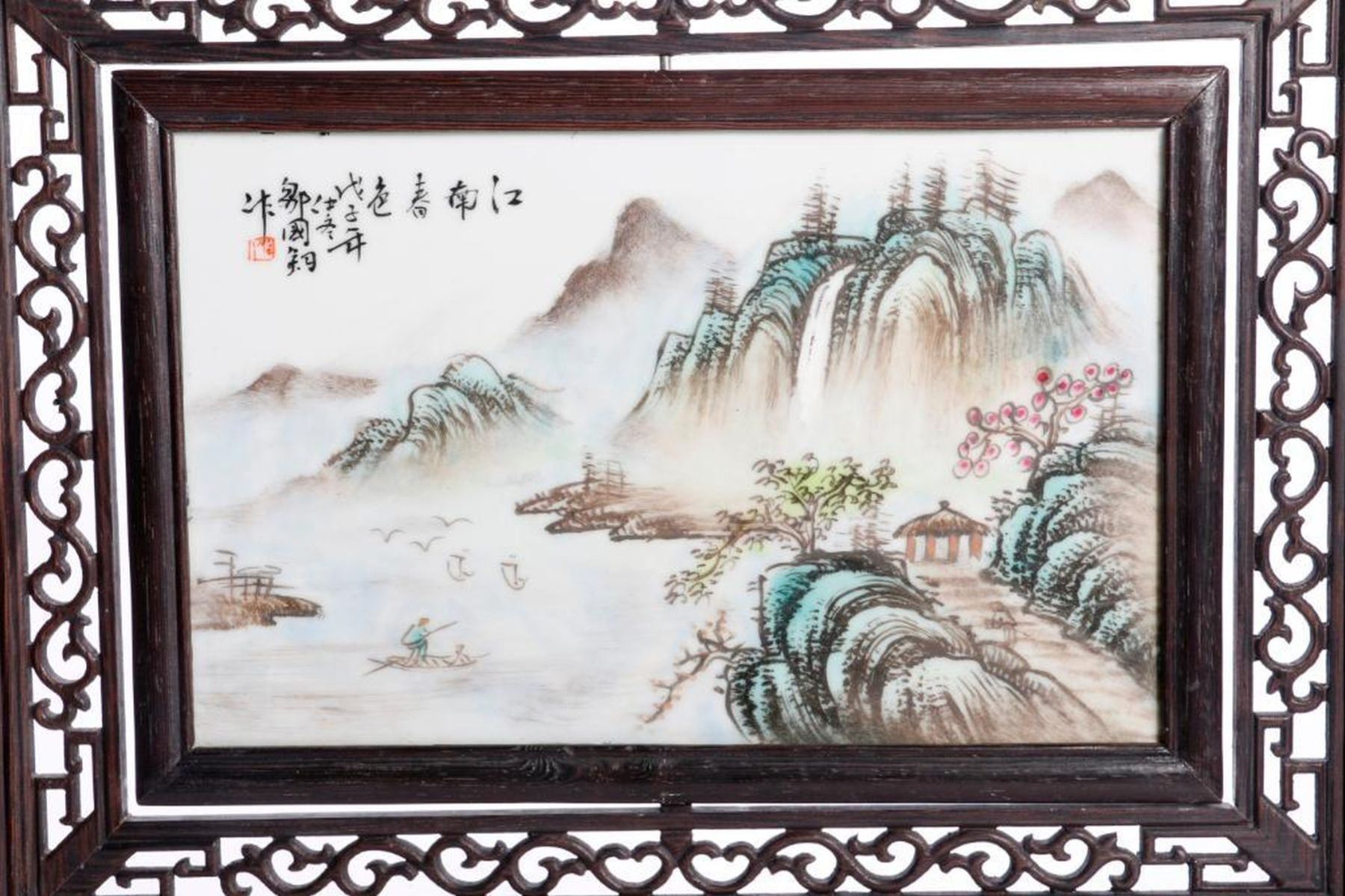 A late 19th/early 20th century Chinese landscape painted on porcelain in a carved frame measuring 15 1/2 high x 15 /.1/2 wide x 4 1/2 deep.