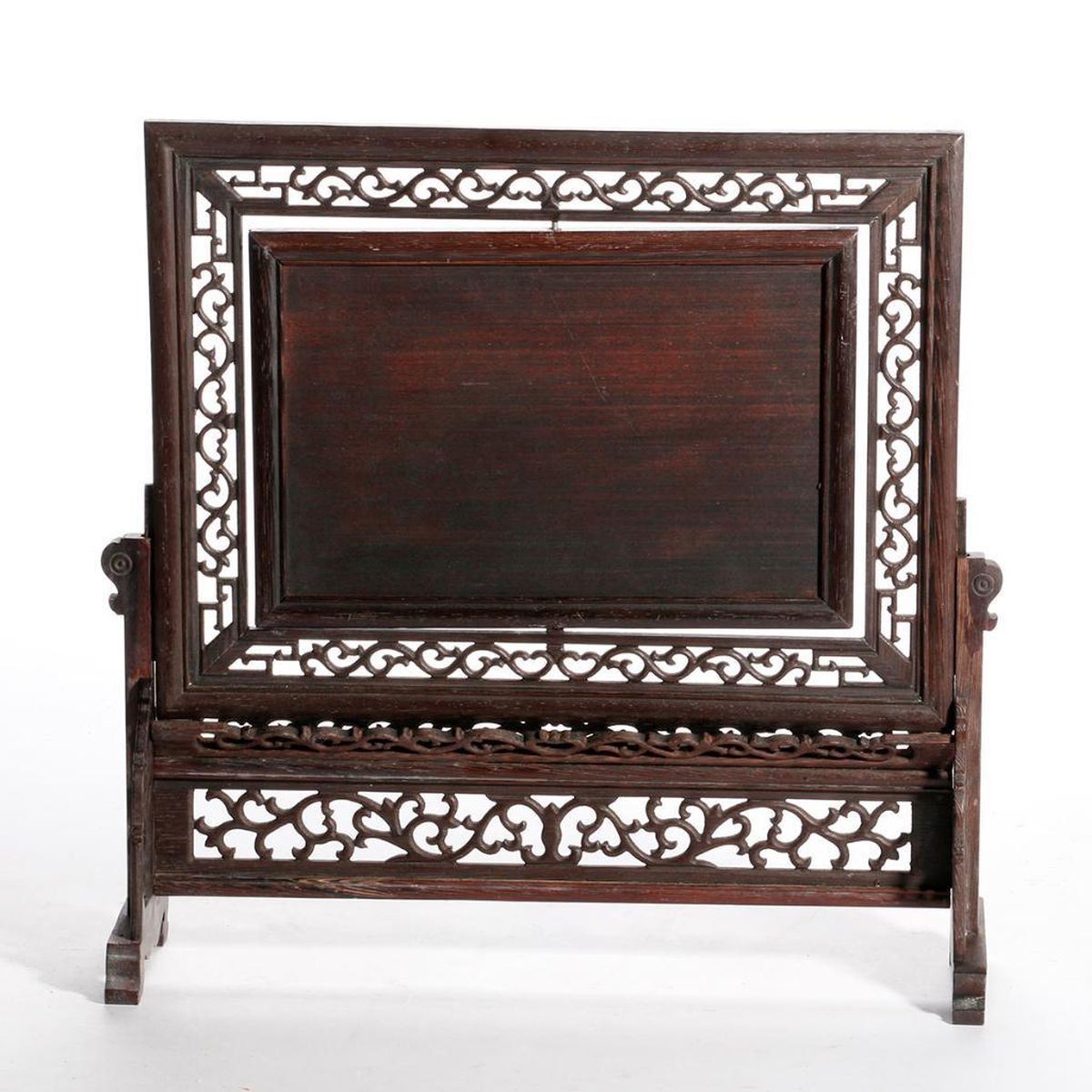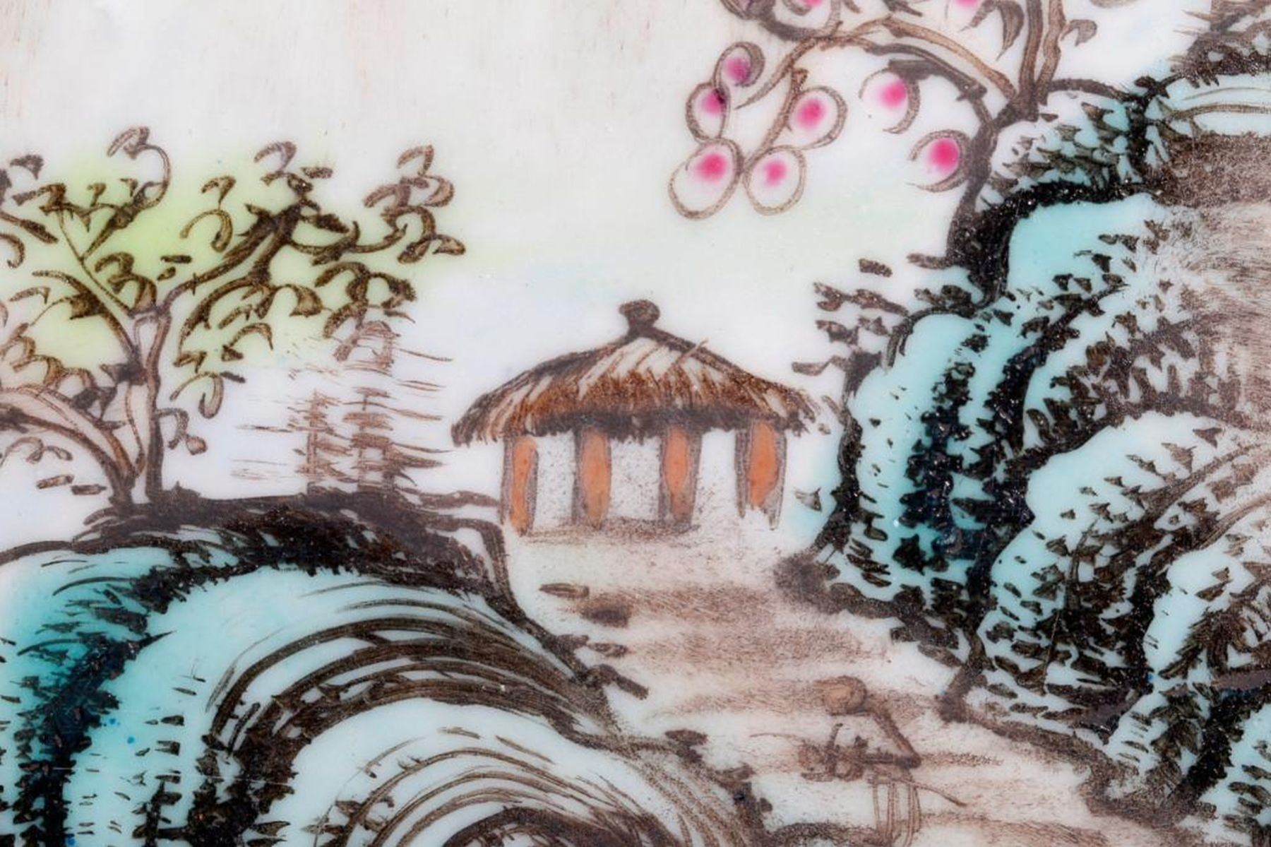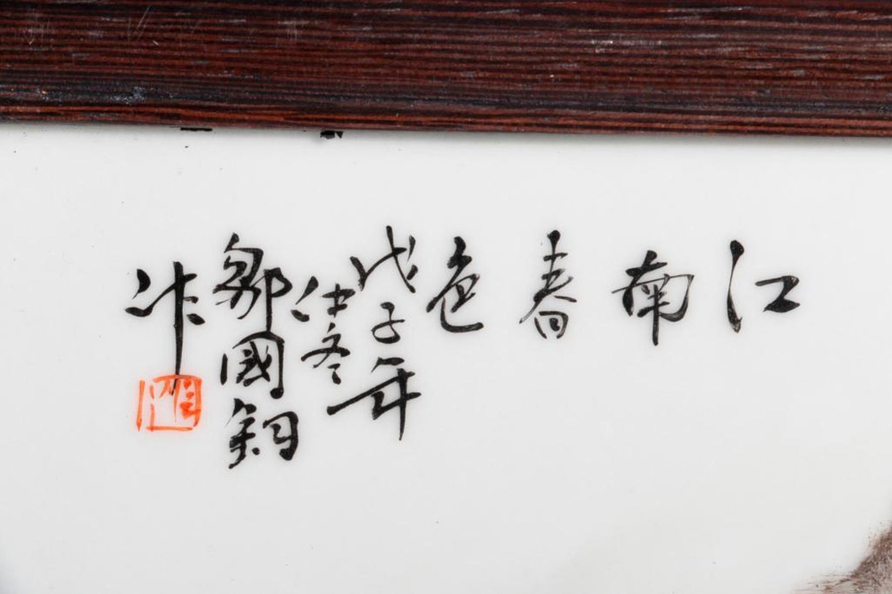 A late 19th/early 20th century Chinese landscape painted on porcelain in a carved frame measuring 15 1/2 high x 15 /.1/2 wide x 4 1/2 deep.