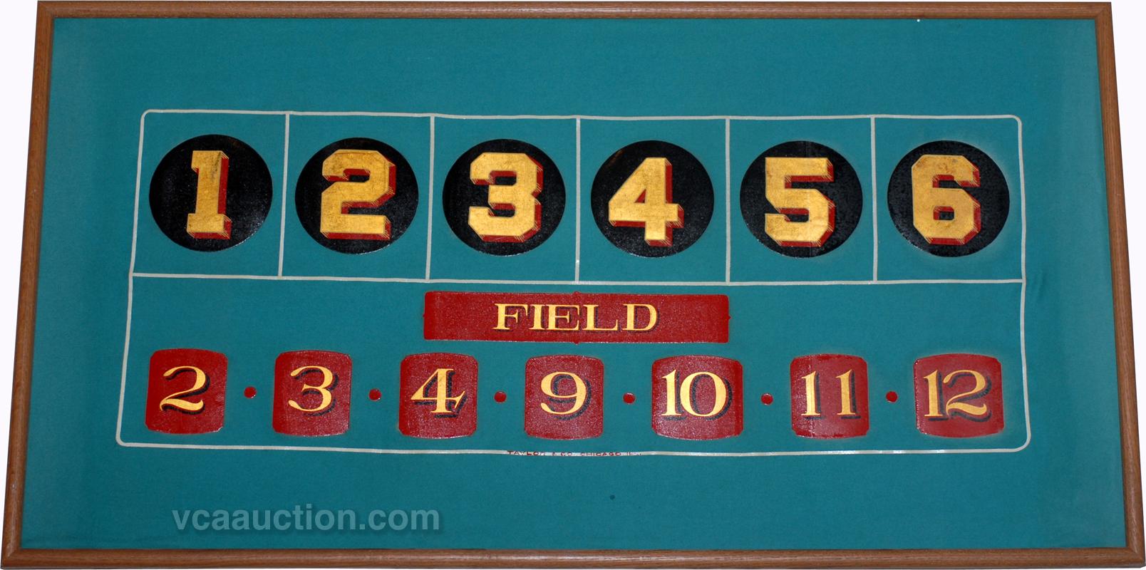 Framed Chuck-a-Luck Layout with Field Bet - Game was played with one odd colored die; all three dice were used to play Chuck while the two dice matching in color were used for the field bet. Framed layout measures 45" by 23"; maker is Taylor & Co., Chicago. Excellent condition, rarely seen, c1930.
