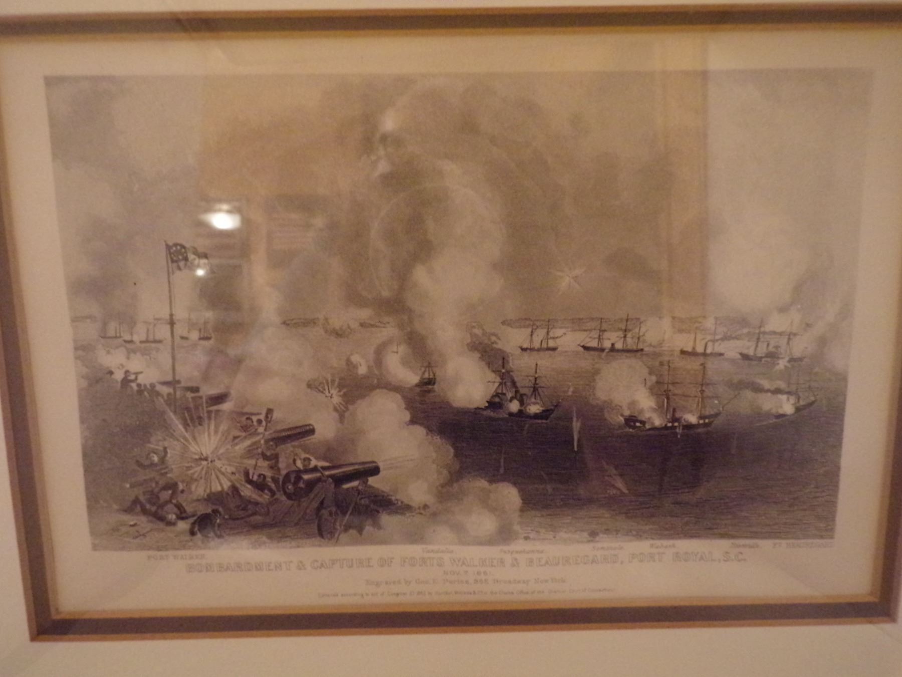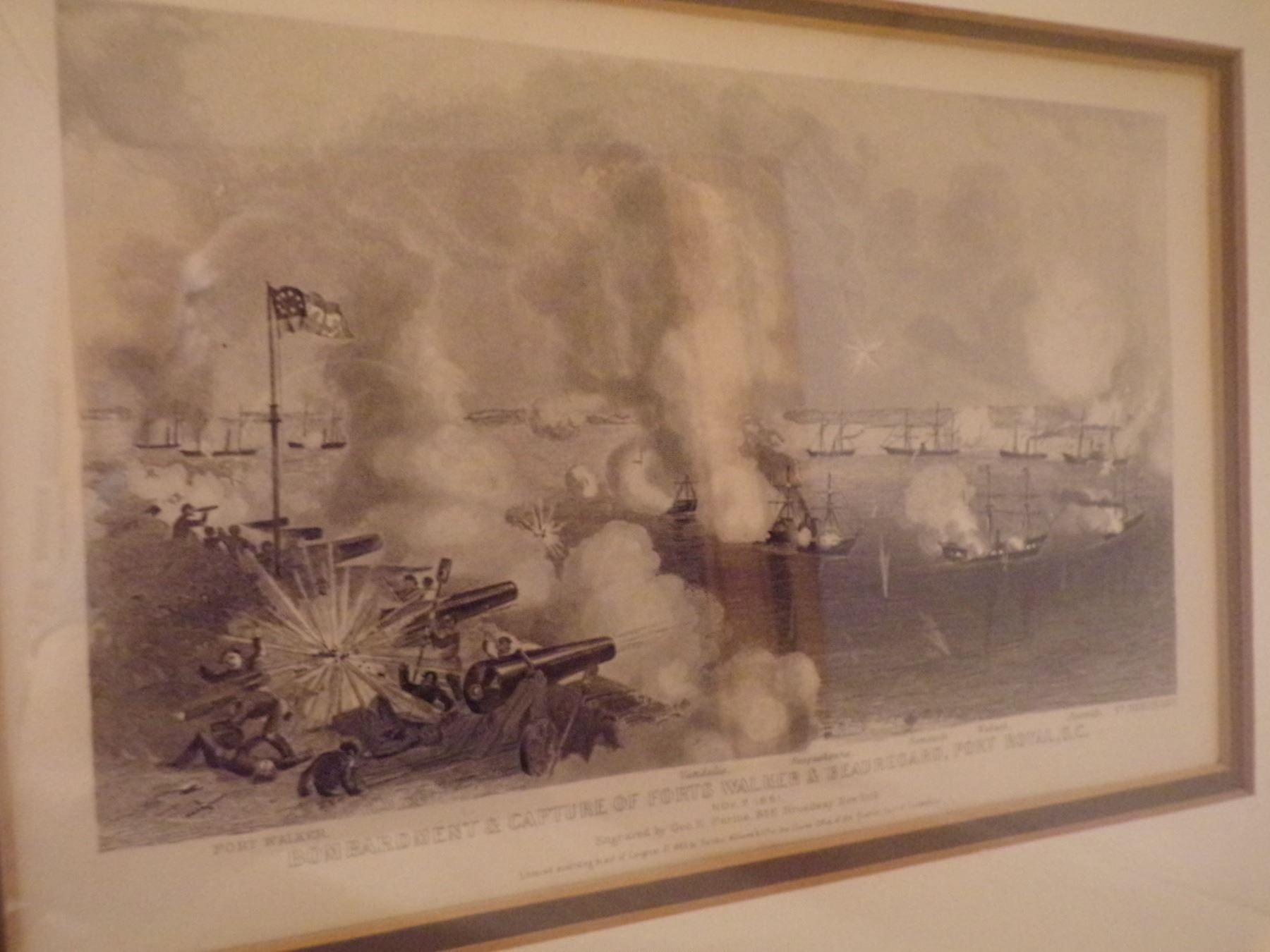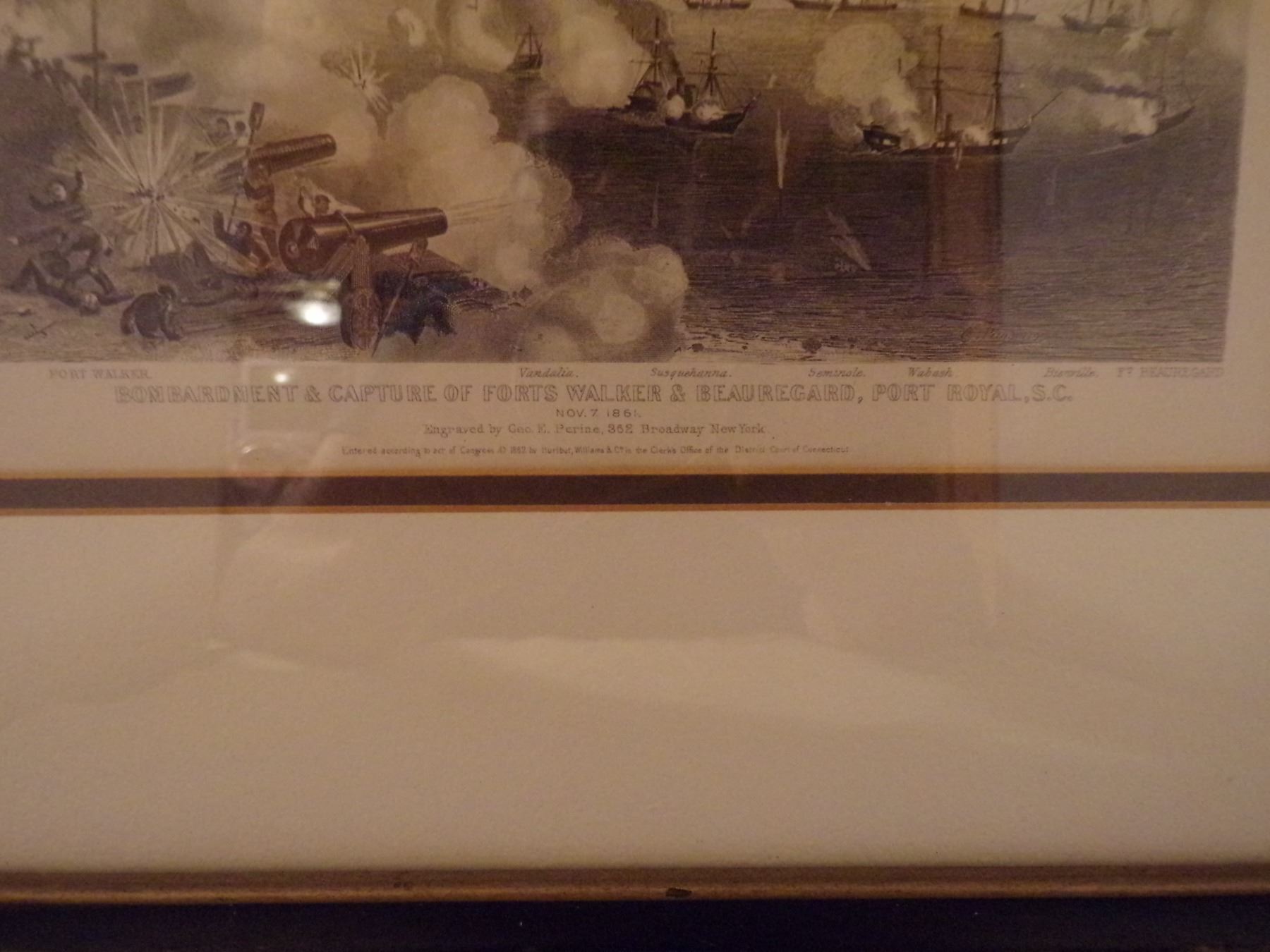 Framed Civil War Engraving of 1861 Bombardment of Ft. Walker and Ft. Beauregard, Ft. Royal South Carolina, double matted 1861 engraving showing the Bombardment and capture of Forts Walker and Beauregard, Fort Royal South Carolina, the battle was fought on Nov. 7, 1861, engraved by Geo. E. Perine, 362 Broadway, New York, the engraving is labeled to show Ft. Walker on the far left and Ft. Beauregard on the far right, under glass, overall measurement of 12.75'' x 10.25''