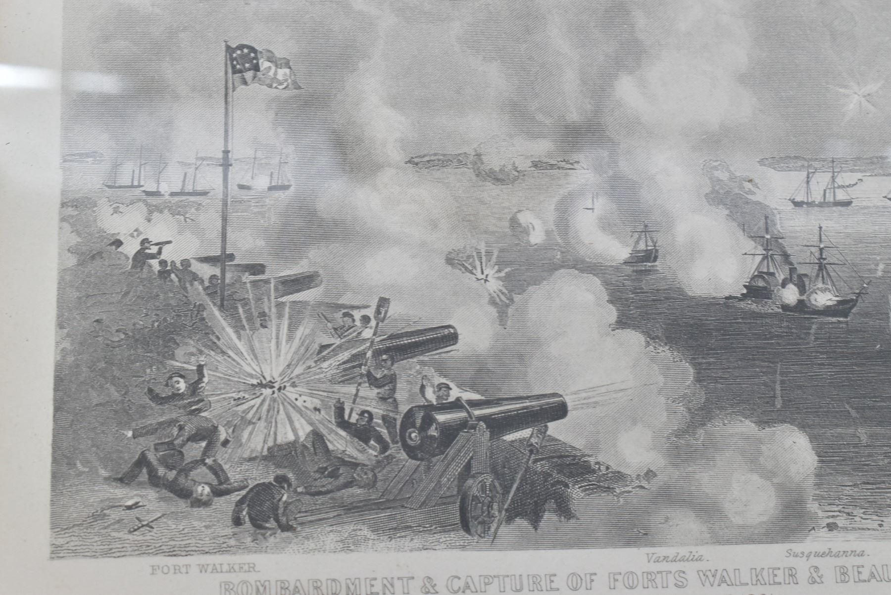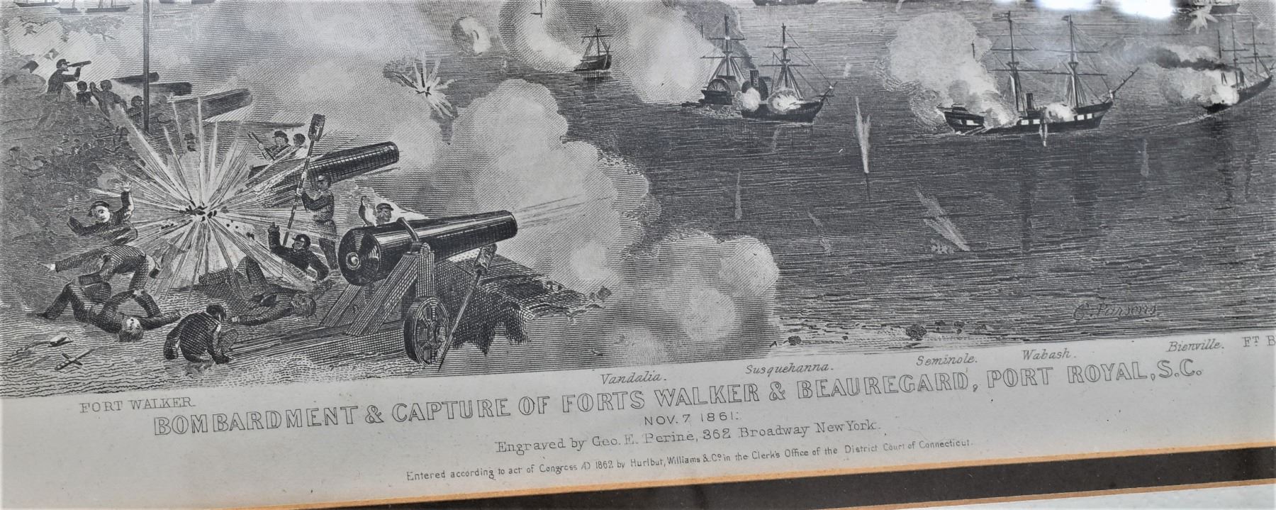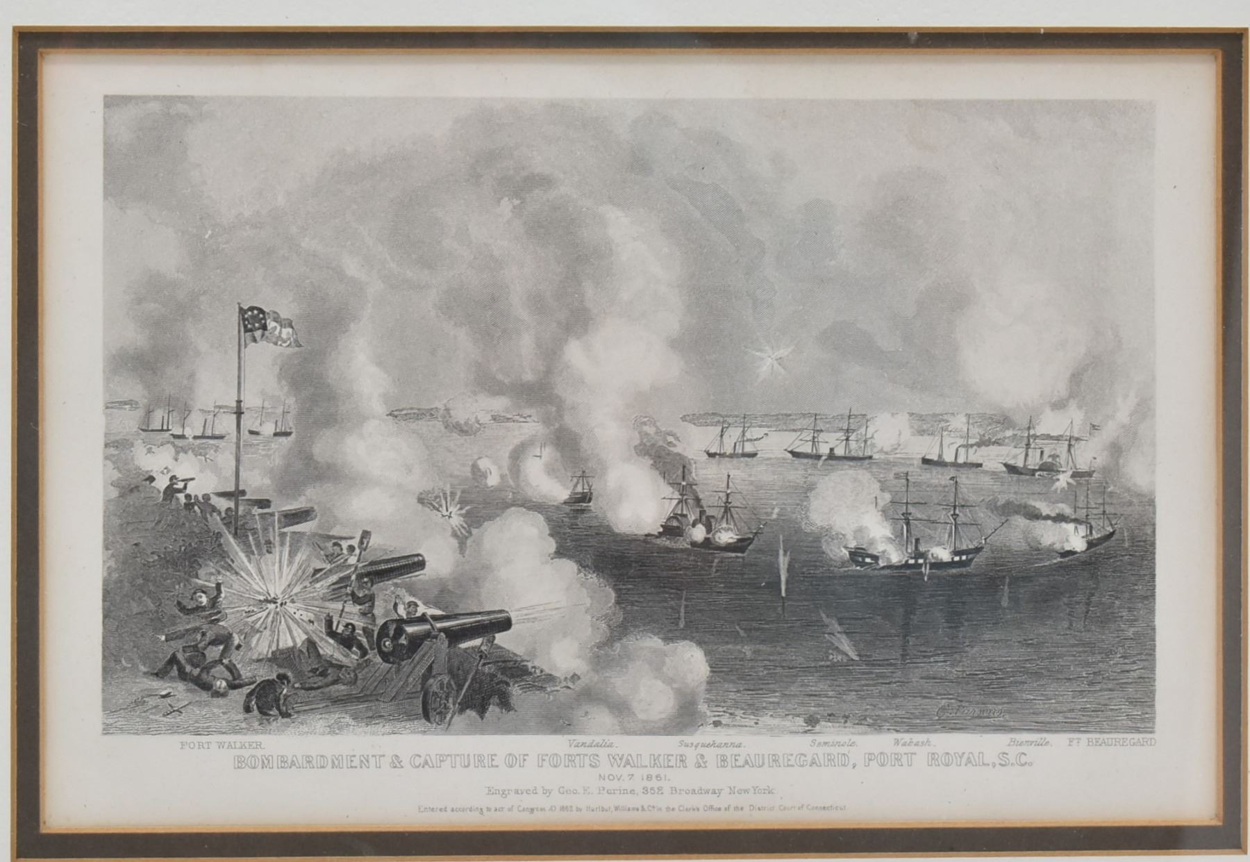 Framed Civil War Engraving of 1861 Bombardment of Ft. Walker and Ft. Beauregard, Ft. Royal South Carolina, double matted 1861 engraving showing the Bombardment and capture of Forts Walker and Beauregard, Fort Royal South Carolina, the battle was fought on Nov. 7, 1861, engraved by Geo. E. Perine, 362 Broadway, New York, the engraving is labeled to show Ft. Walker on the far left and Ft. Beauregard on the far right, under glass, overall measurement of 12.75'' x 10.25''