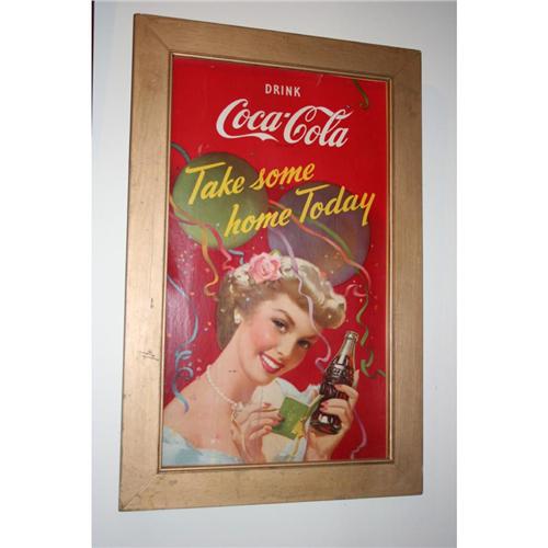Framed Coca-Cola Advertising Sign - Take Some Home Today - A lovely lady with a bottle of Coke.  Gold painted wooden frame measures approximately  20" x 30 ½" T.