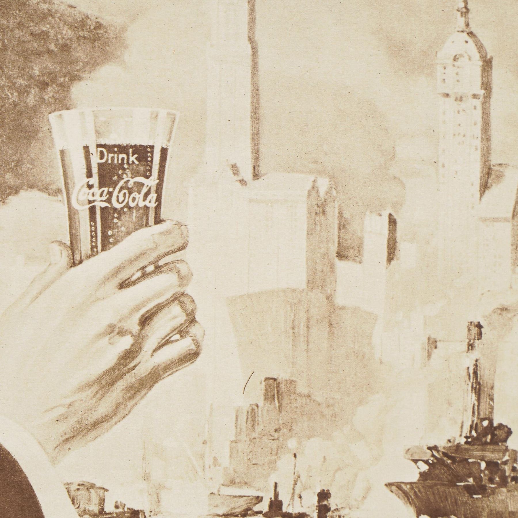 A vintage Coca-Cola advertisement poster in sepia tones, professionally matted and framed. The artwork features a detailed illustration of a hand holding a classic Coca-Cola glass with a frothy drink, set against an urban cityscape with skyscrapers and warships in the harbor below. The poster includes the iconic slogan Drink Coca-Cola – Delicious and Refreshing prominently displayed at the top. The sepia style gives the piece a nostalgic, historical feel, possibly dating from the World War II era or created in homage to that time. This collectible print is mounted in a gold-tone frame with a decorative border and white matte, ideal for lovers of vintage Americana or Coca-Cola memorabilia.