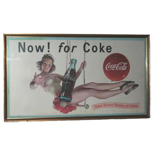 Framed Coca Cola lithograph sign entitled “Now for Coke” depicting an attractive young lady on trapeze.  In bottom left corner: Copyright 1959, The Coca Cola Company ,Litho in U.S.A.  On bottom center: Display in March, April, May, and June.  Sign measures approx. 37" x 21" framed.  Sign shows some soiling as would be expected of a piece of this age.  No signs of damage are observable.  Makes a very attractive presentation in it framed condition.