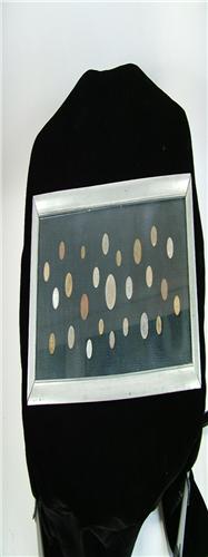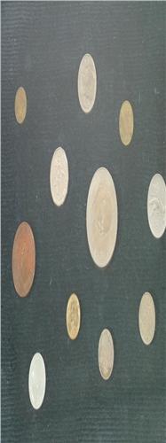 Coin collection from the 1940s-1950s with coins from England, Austria, Peru, Columbia, Japan, China, and Mexico, 24" by 9".