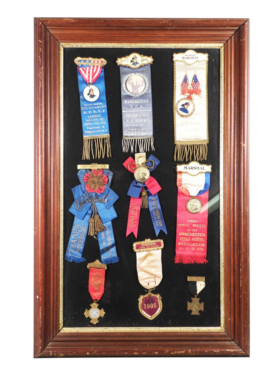 Framed Collage of 9 Firemen's Ribbons including several with celluloid buttons. New England states from 1899. Various sizes and conditions. 17 X 26 inches.