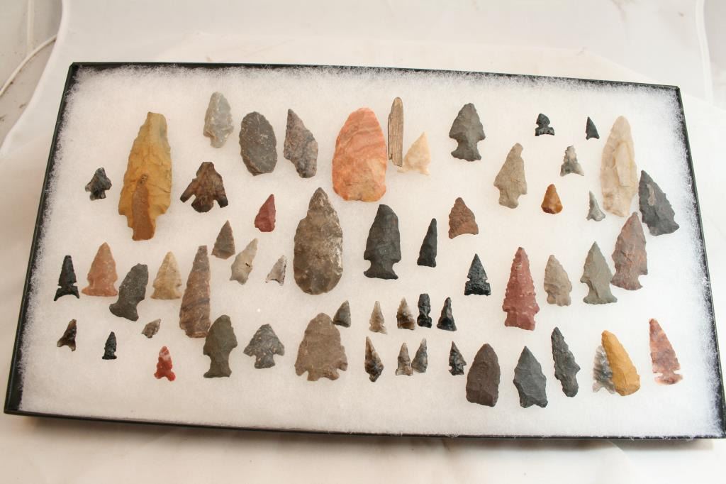 Framed Collection of Authentic Antique Flint Points and Blades. About 50 Points.
