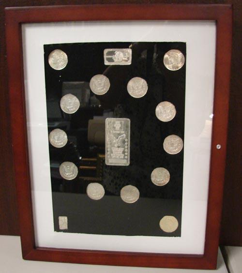 Framed Collection of Morgan Silver Dollars & Silver Bars