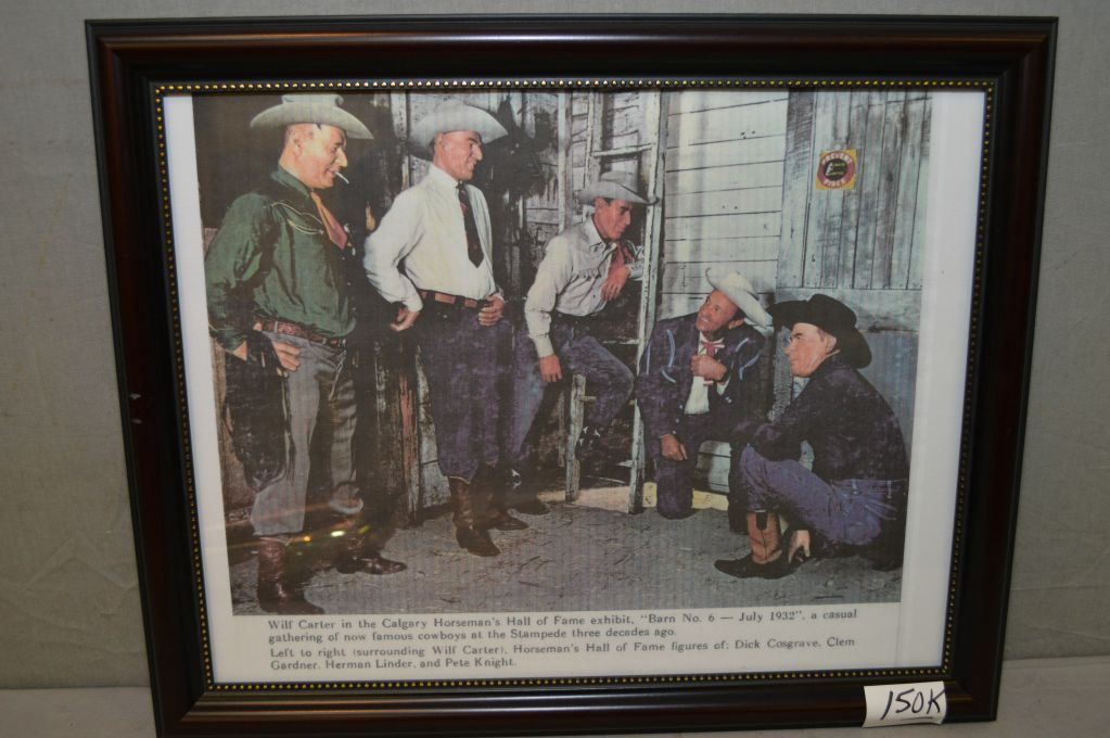 Framed Copy of Newspaper Article : Wilf Carter in the Calgary Horseman's Hall of Fame Exhibit : Barn No. 6 July 1932, a casual gathering of now famous Cowboys at the Stampede [ Wilf Carter, Dick Cosgrave, Clem Gardner, Herman Linder, Pete Knight ]