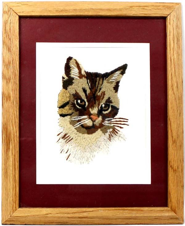 Framed Crewel Embroidery Cat Picture, framed, double matted, and under glass, visual measures 7.5'' x 9.5'', overall framed measurement of 13'' x 16''