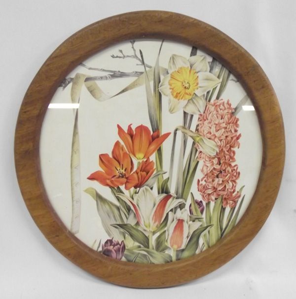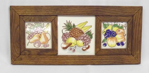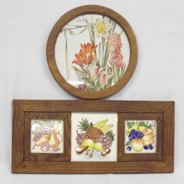 Framed Decorative Tiles and Framed Flower Print. Here's a threesome of 3 colorful tiles in a nice oak frame for hanging on the wall. Also there is an oak framed print of wildflowers, under glass. The framed tiles are 20''Wx8.5''H. The framed print is 11.25'' diameter.