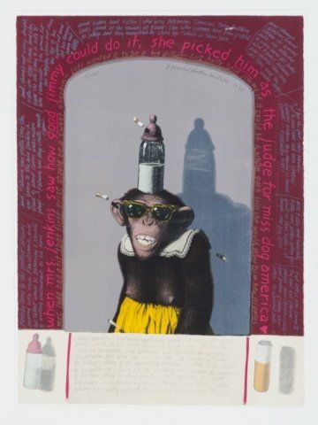 Wilson, Donald Roller (Arkansas, b. 1938). Color lithograph of monkey with bottle and cigarettes surrounded by text. Numbered and signed at top, "11/100 Donald Roller Wilson". Matted and framed under glass. 30" x 22". Frame: 40" x 31 1/2".