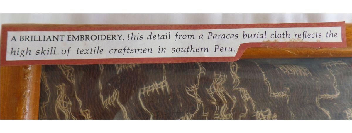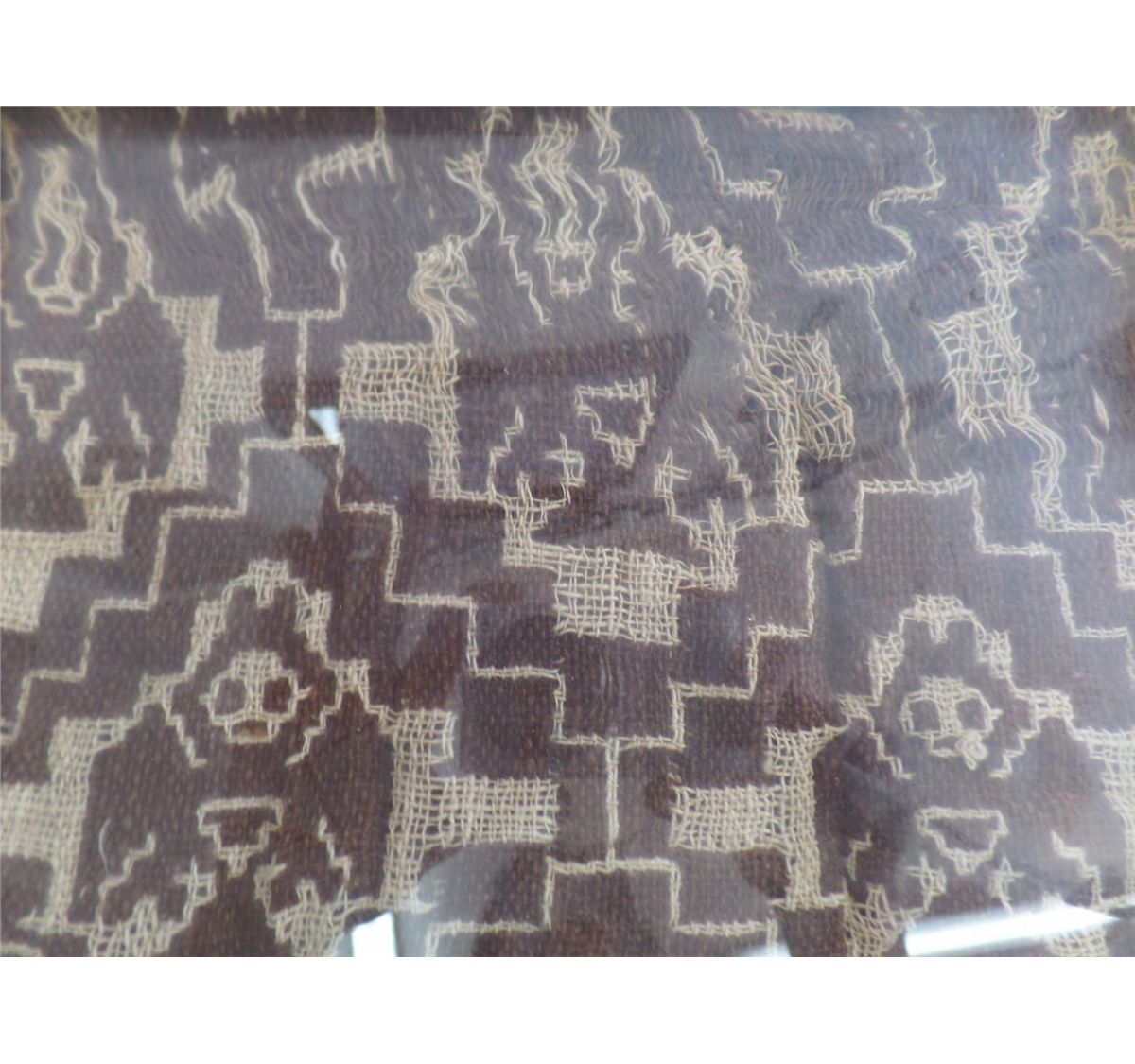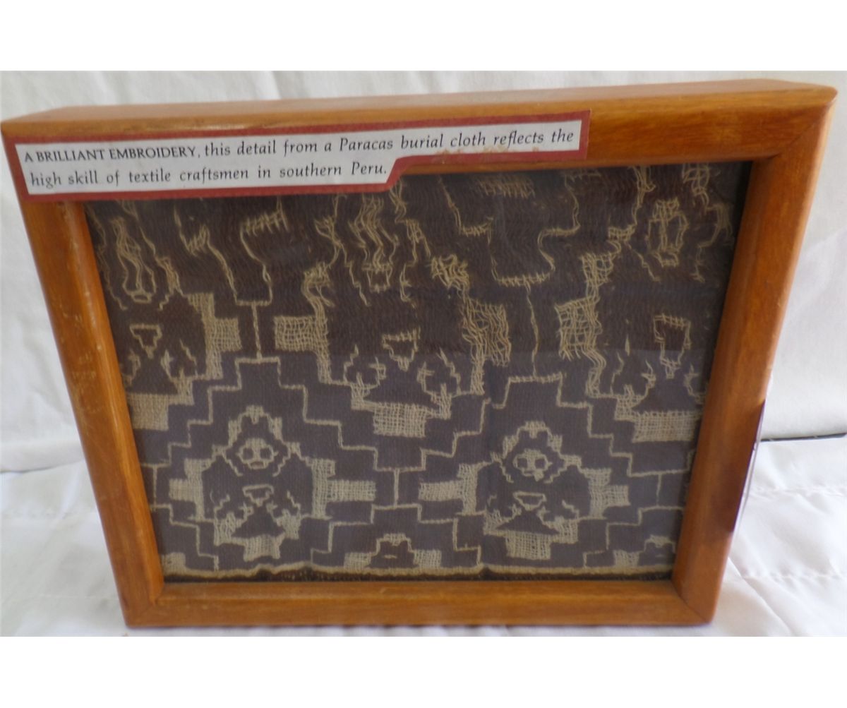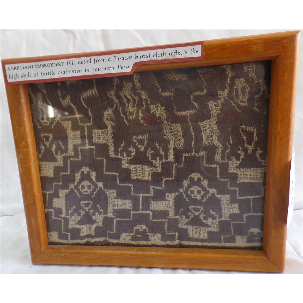 Framed Fragment of South American Burial Cloth. Frame measures 11" x 9" x 2.5" and rough estimate of fragment to be 8" x 10". Condition: As found. Shipping: $18.