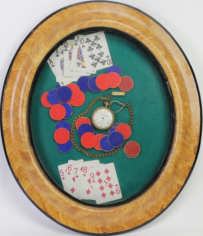 Framed Gamblers shadow box, includes card suites, pocket watch and chain, and poker chips, 22" tall X 19" wide.card suites, pocket watch and chain, and poker chips, 22" tall X 19" wide.