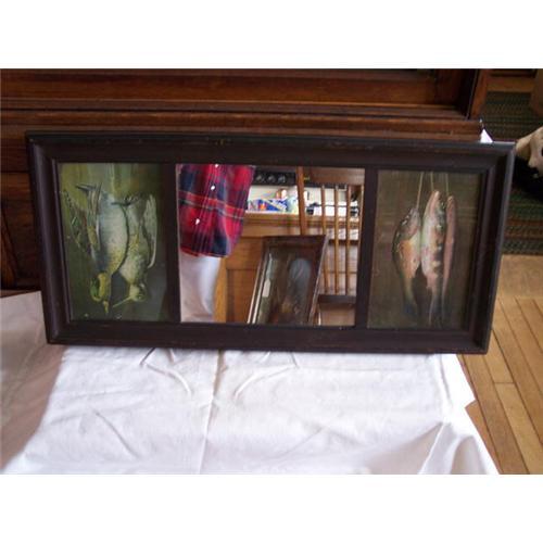 This is another game print with fish on one side and birds on the other.Has a mirror in the middle(please excuse reflection in mirror).The mirror has been replaced and is not original to the piece.There is some damage to the prints but does not detract from pictures.Some scrapes on frame but a good oiling would help.Measures 30 1/4x14 1/2.These are great for a cabin or a lodge,or just to collect for the sportsman.