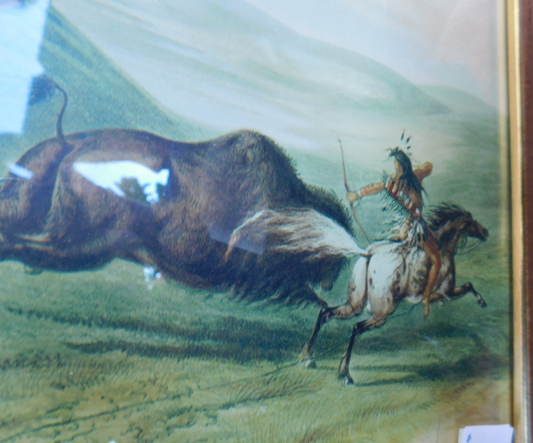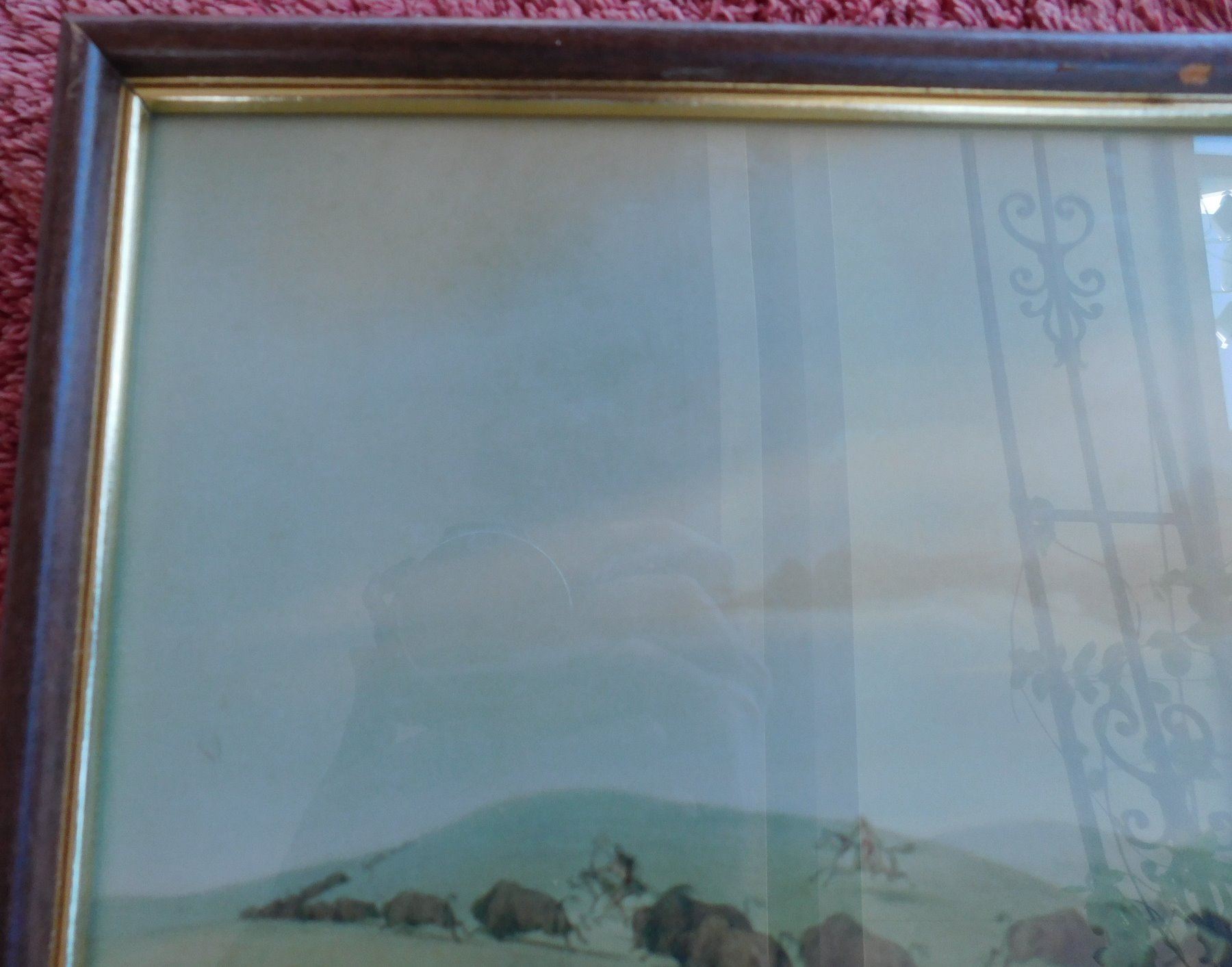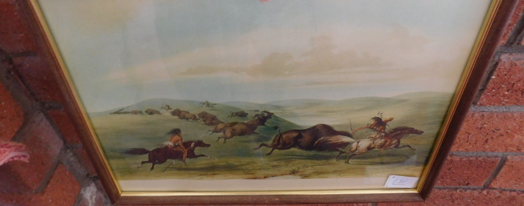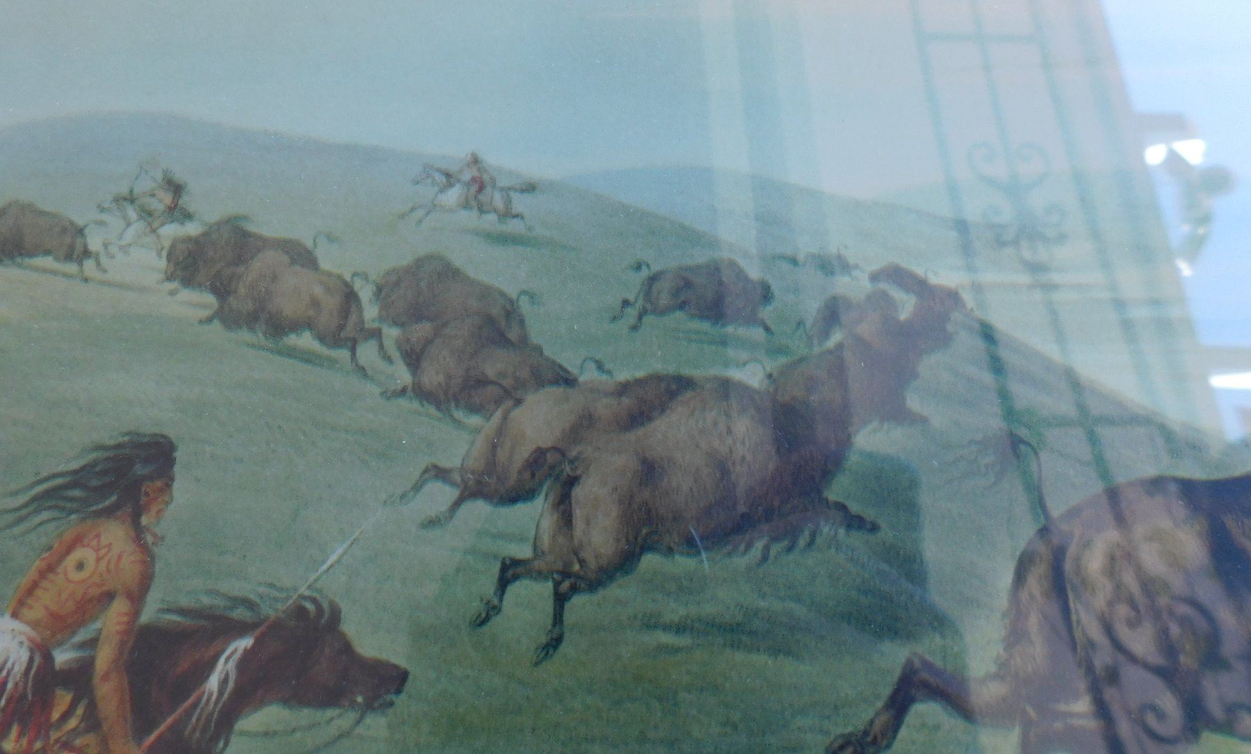 Framed George Catlin Print, 20th century item. Made of wood, glass and paper, the print measures 16" x 12". USA. Hunting buffalo. Condition: Good, see images. Shipping: $26.50 w/insurance and signature.