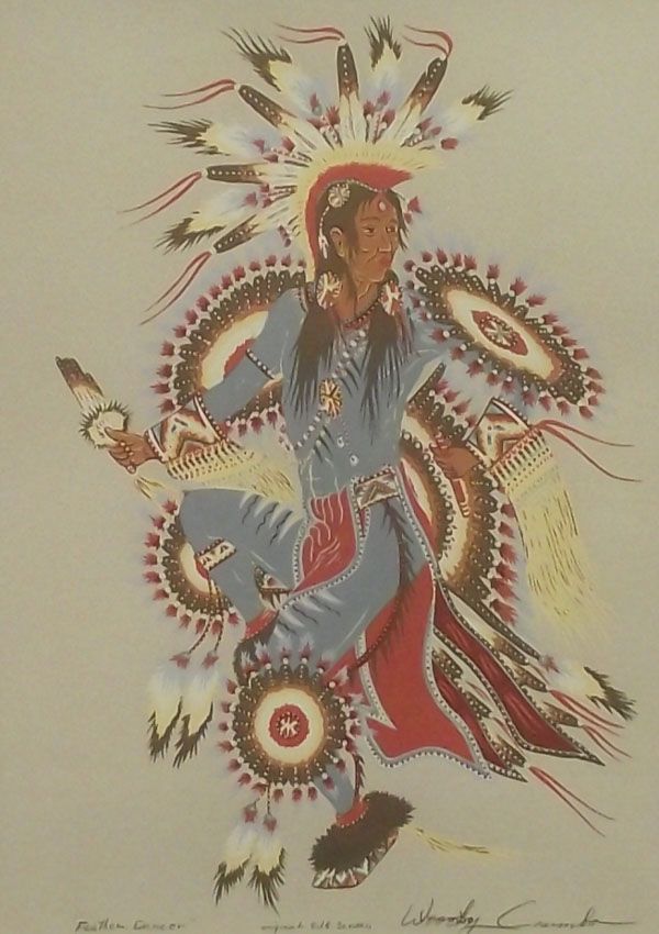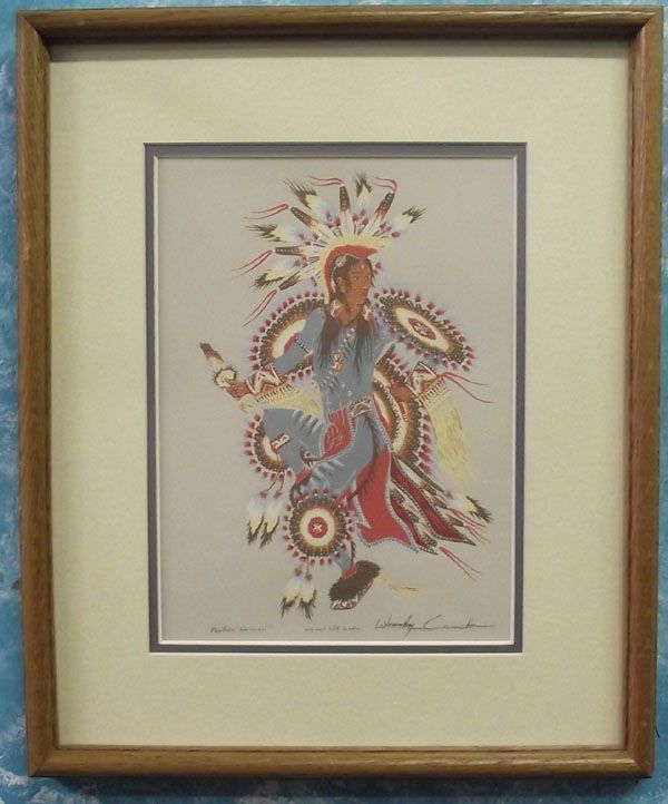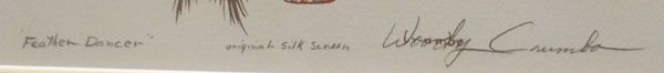 From the Nick and Suzanne Nicholas Collection we have a Framed Hand Signed Silkscreen by Woody Crumbo, framed and double matted under glass, hand signed by artist Woody Crumbo Feather Dancer original silkscreen, visual measures 11.75'' x 8.75 and framed it is 18.5'' x 15.5, Woodrow Wilson ''Woody'' Crumbo (January 21, 1912-April 4, 1989) was a Potawatomi artist, flautist, and dancer. As an independent prospector, he found one of the largest beryllium veins in the nation. His paintings are held by several prominent museums, including the Smithsonian Institution and the Metropolitan Museum of Art.[2] A 1978 inductee into the Oklahoma Hall of Fame,[3] Crumbo became an ''ambassador of good will'' for Oklahoma in 1982 under appointment by Governor George Nigh. Born near Lexington, Oklahoma, Crumbo moved with his mother to Kansas as a child after the death of his father in 1916. Orphaned in 1919, he spent the rest of his childhood living with various American Indian families around Sand Springs, Oklahoma. When Crumbo was 17, he began studying art at the Chilocco Indian Agricultural School, also taking up the study of the Kiowa ceremonial wooden flute. Later he soloed on this instrument in performance with the Wichita Symphony.