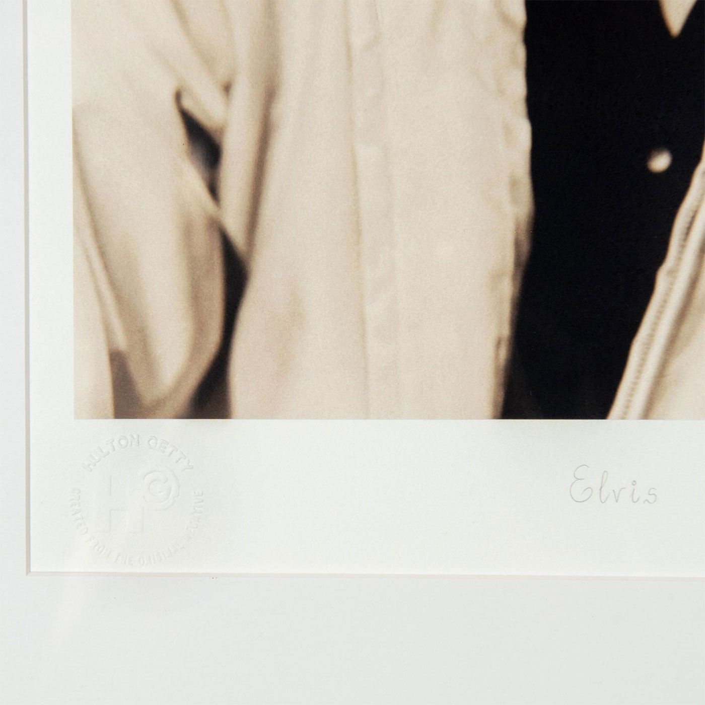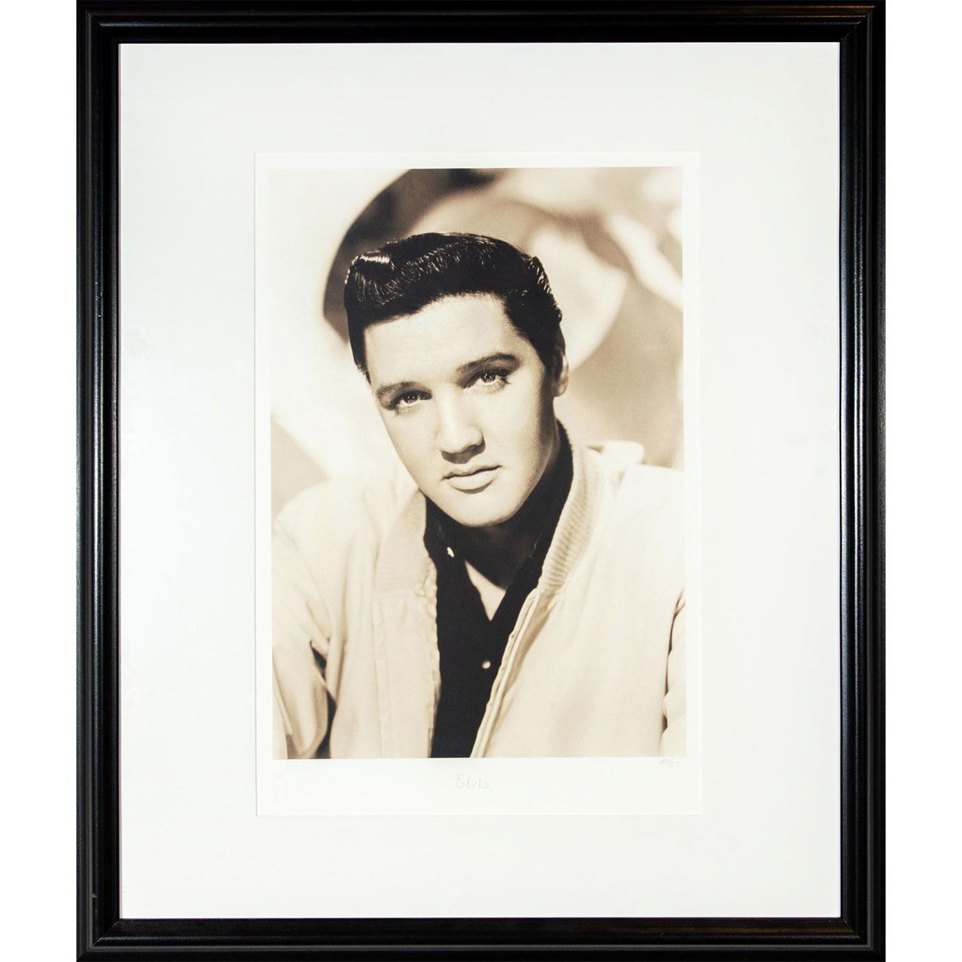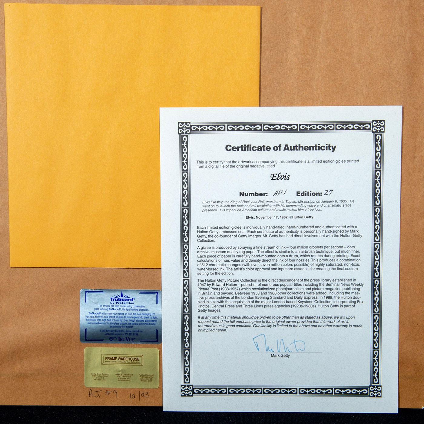 American king of rock and roll, Elvis Presley (1935- 1977). One small scratch on frame. With Certificate. Originally taken on November 17, 1962. This is a later limited edition reproduction from the original negative. Embossed: lower left with Hulton Getty stamp, Titled in plate: lower center, and Numbered in pencil: lower right.