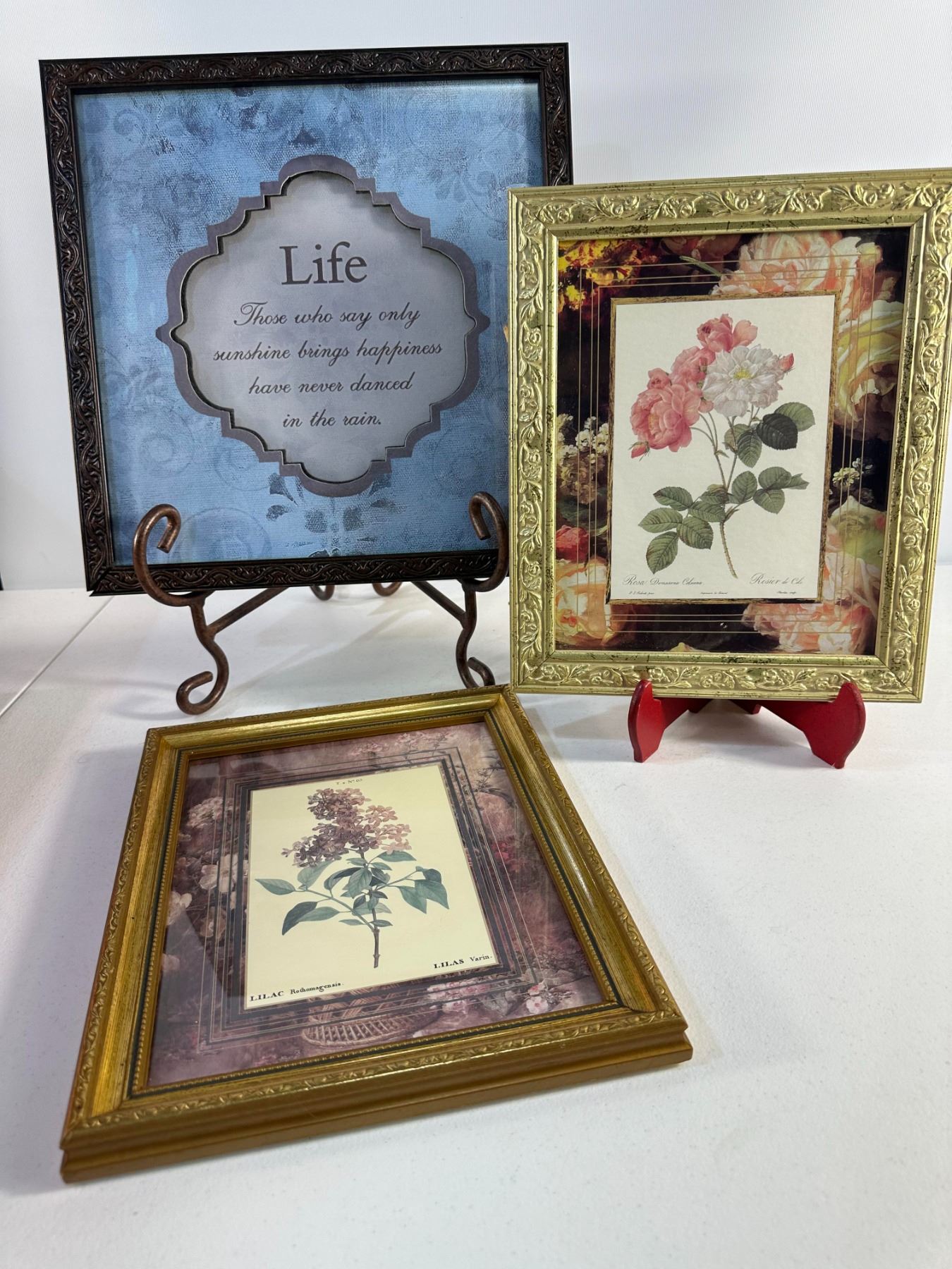 Trio of framed wall art pieces including a Life inspirational quote and two botanical prints featuring lilacs and roses. Elegant vintage-style frames with rich color tones. Very good display condition.