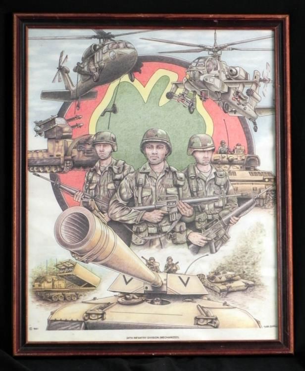 Offered is this Framed Iraqi Freedom Picture. It is 17.5" x 22". It showcases the 24th Infantry Division.