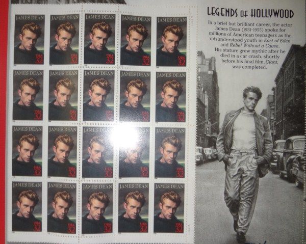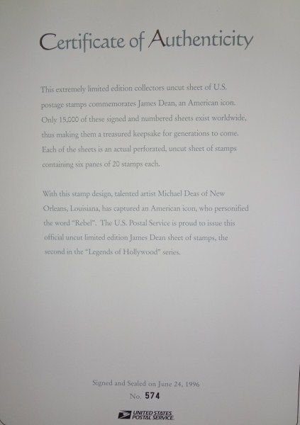 This extremely limited edition collectors uncut sheet of U.S. postage stamps commemorates James Dean, an American icon. Only 15,000 of these signed and numbered sheets exist worldwide, thus making them a treasured keepsake for generations tocome. Each of the sheets is an actual perforated, uncut sheet of stamps containing six panes of 20 stamps each. Signed and Sealed on June 24, 1996, No. 574