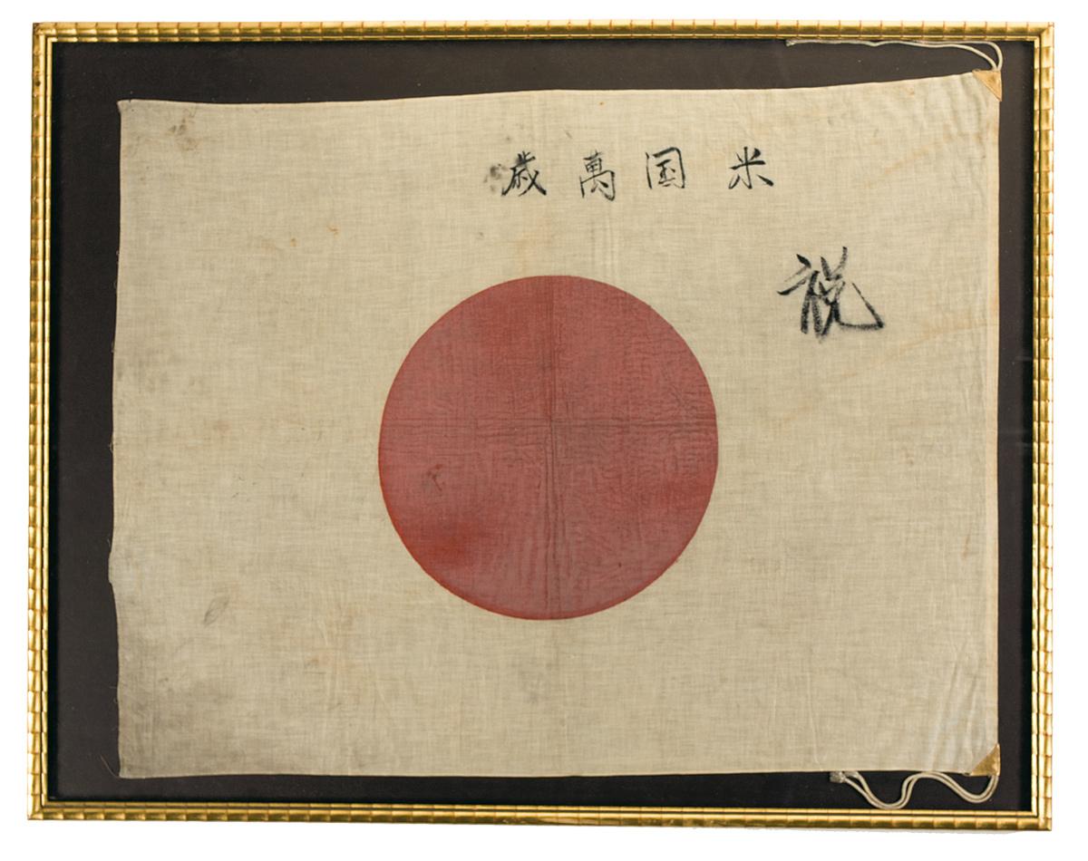 Japanese "meatball/ sun disc" pattern battle flag, linen construction measuring 35 1/2" wide and 27" tall, with a 13 3/4" red disc and a pair of silk cords at the side corners with gold colored leather tabs. A set of 5 untranslated symbols have been added with black ink. Set into a gold painted frame with black matting.