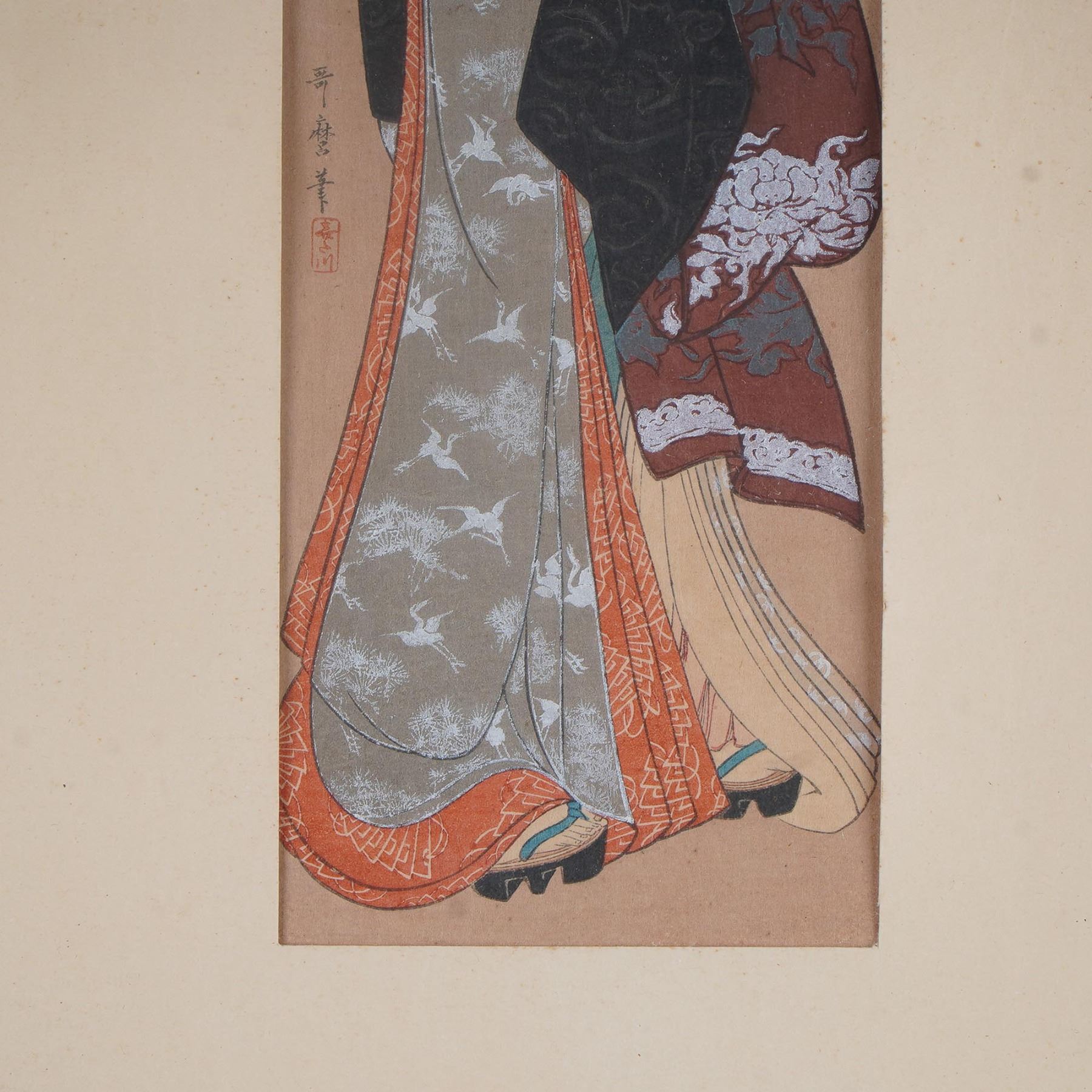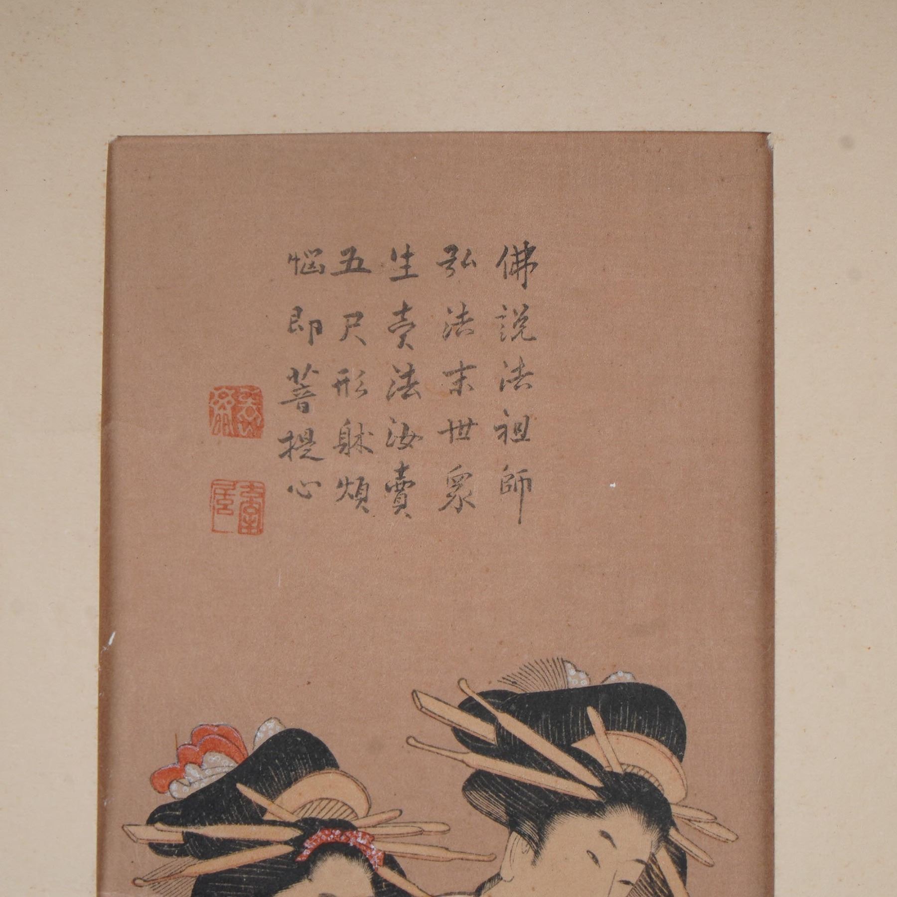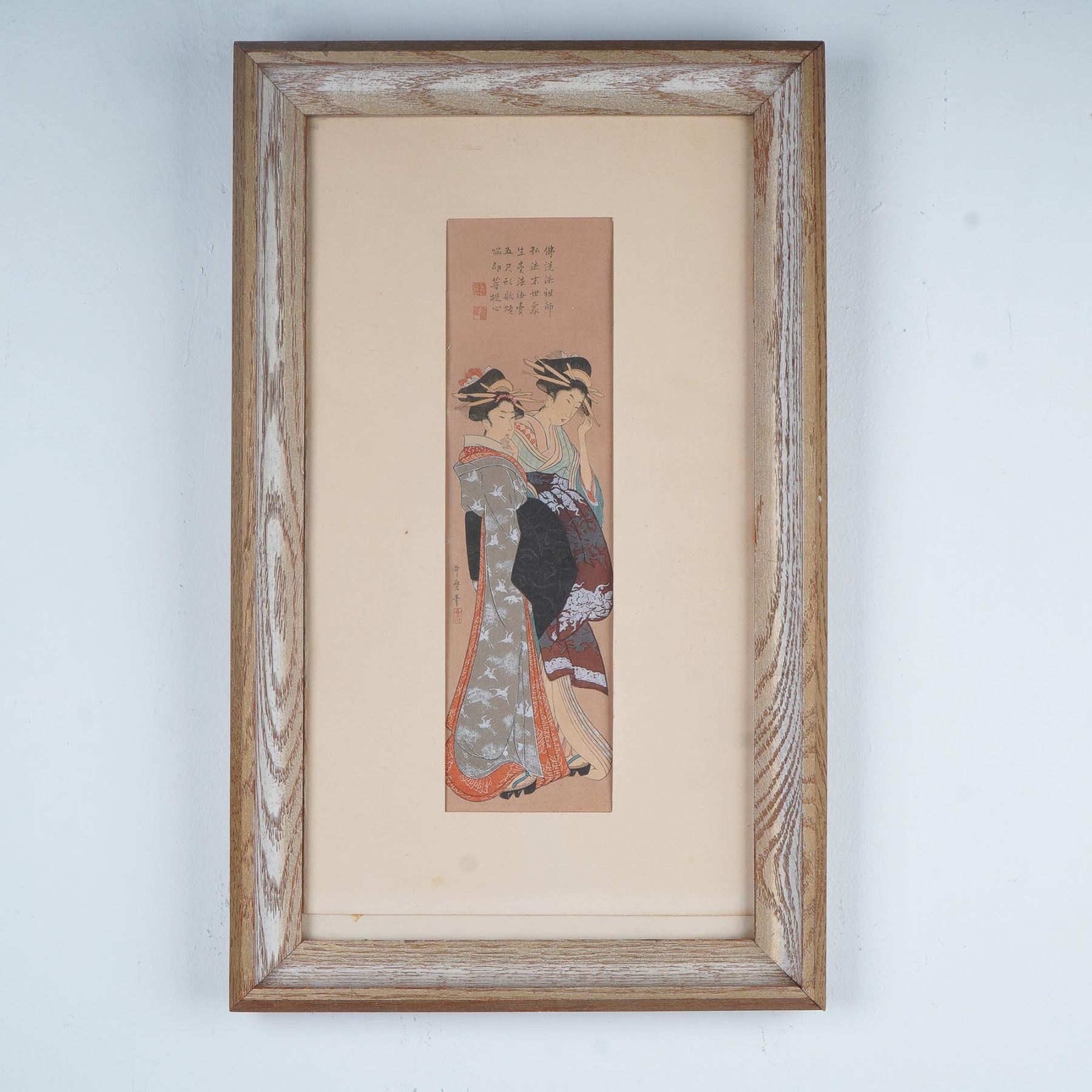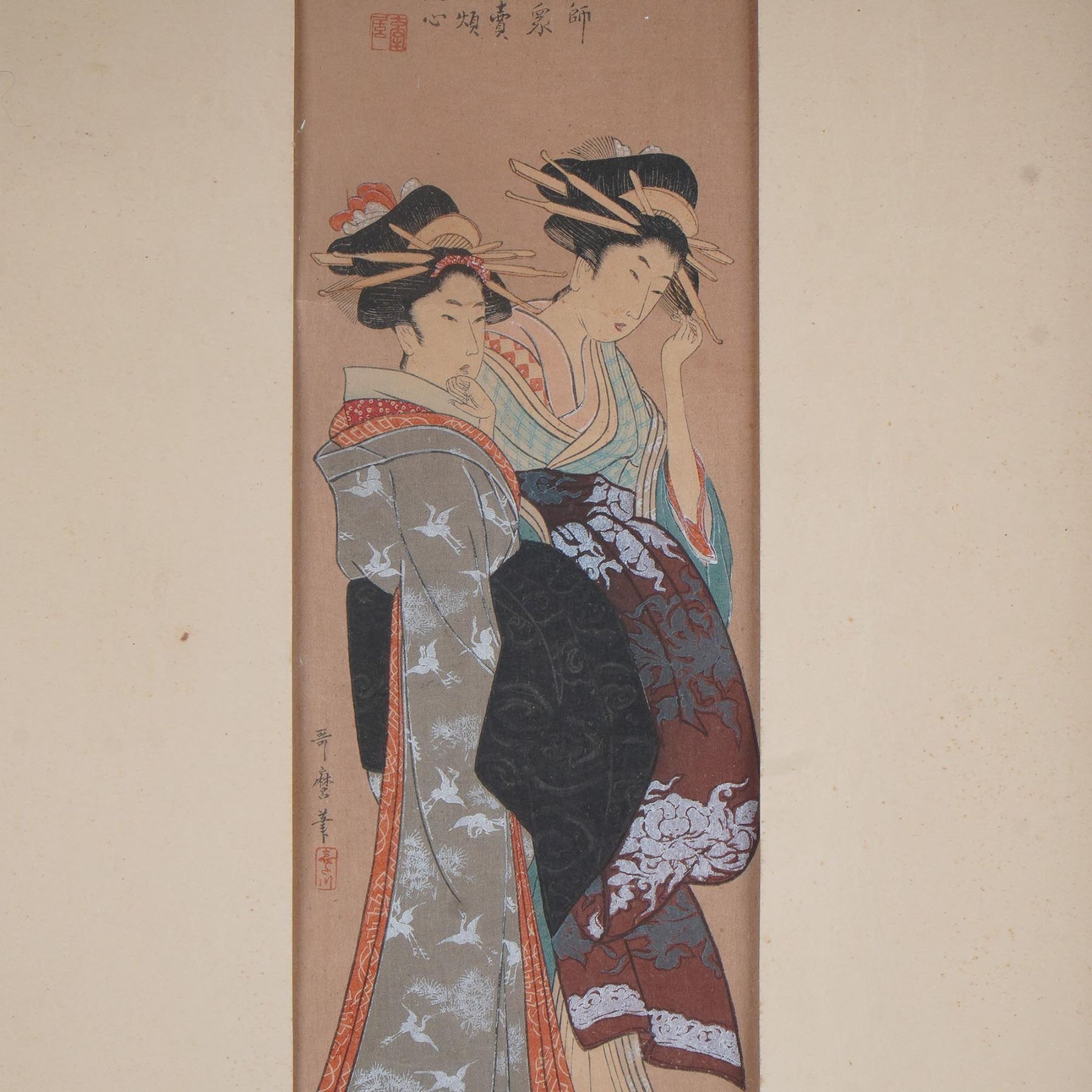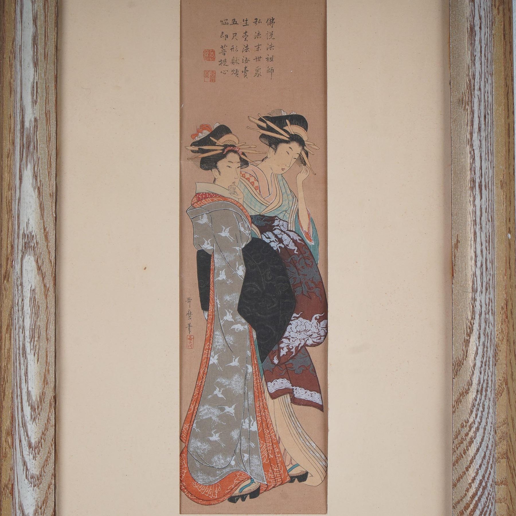 Framed Japanese Woodblock Print, Two Geisha in Kimono