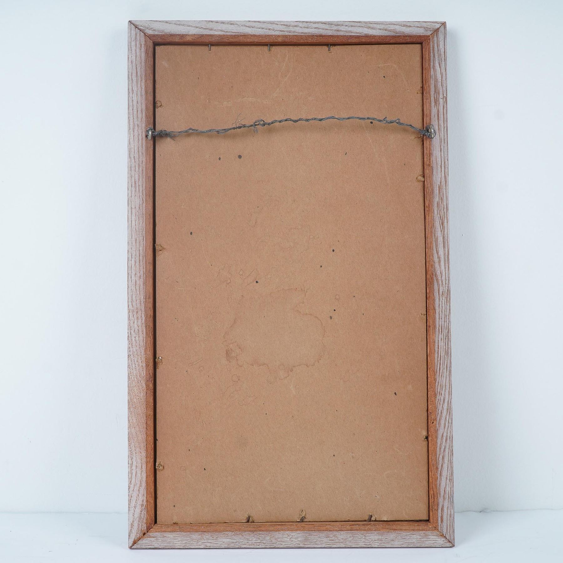 Elegant Japanese woodblock print depicting two geisha figures in traditional kimono, rendered with meticulous detail and soft coloration. The vertical composition features intricate textile patterns, graceful postures, and delicate facial expressions characteristic of ukiyo-e style. Calligraphy and artist seals are visible in the upper left, with a signature on the lower left margin. Housed in a distressed wood frame with cream matting and backed with original board and wire hanger. The print appears to be in good condition with some age-related toning to the mat and minor spotting.