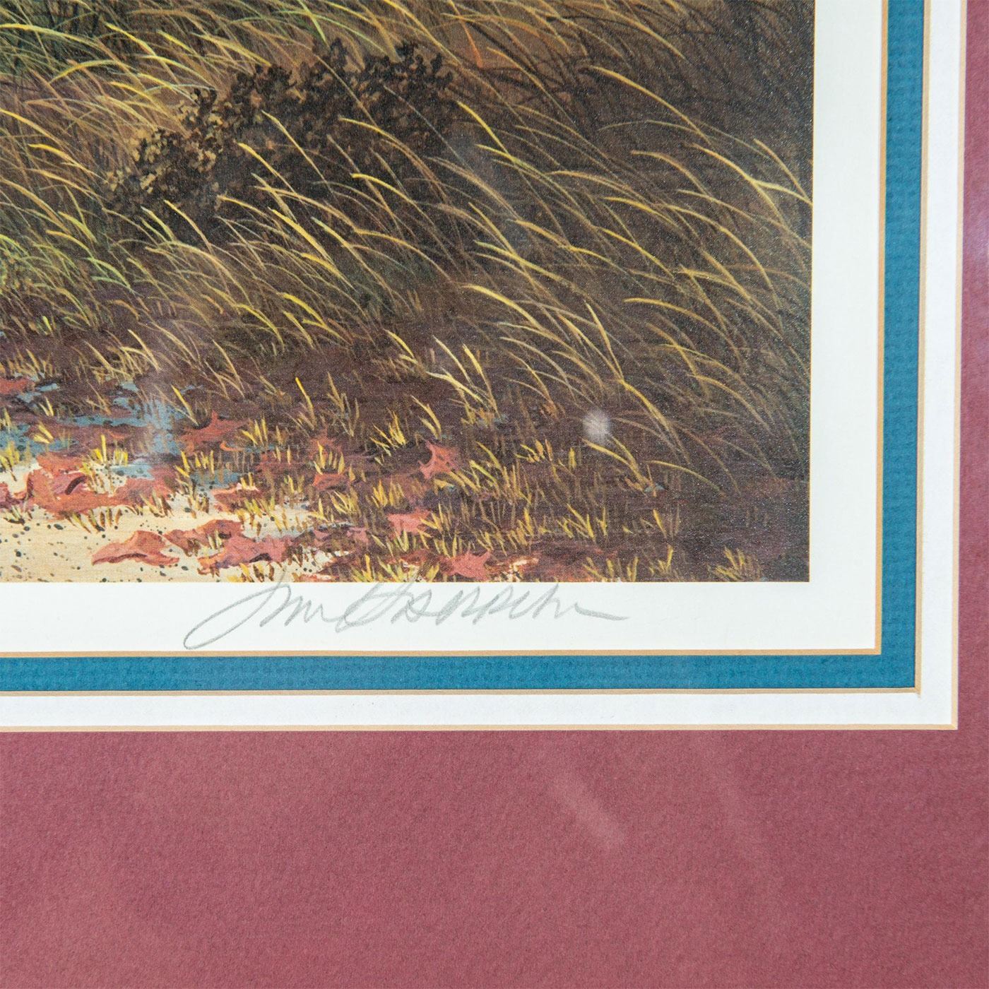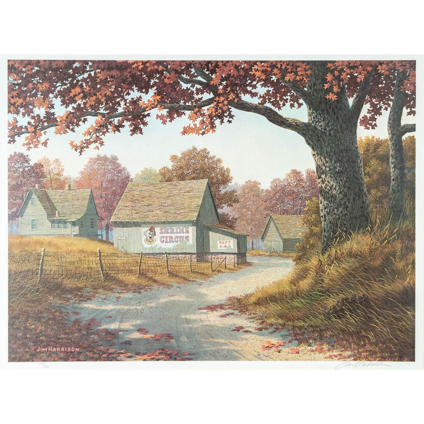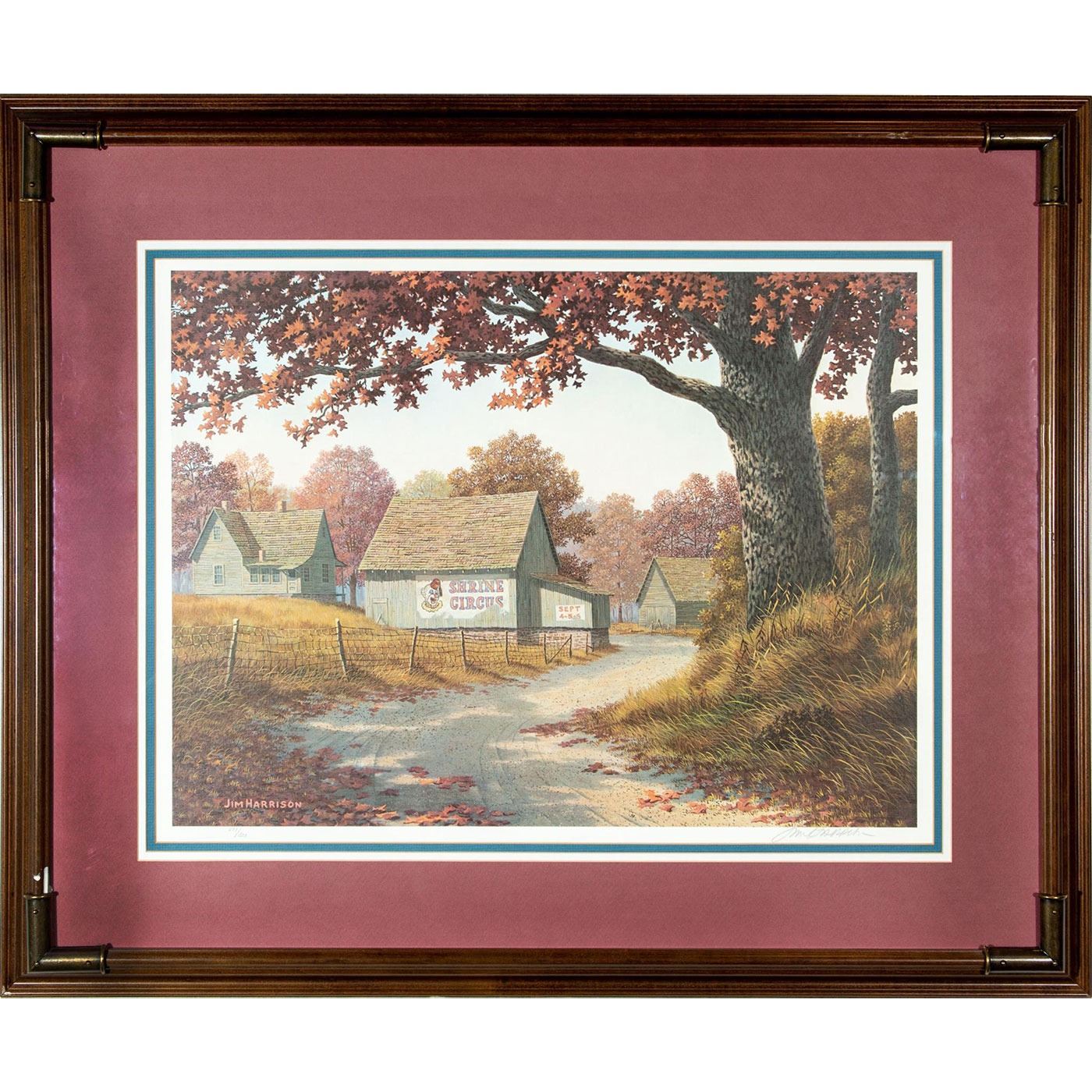 Limited edition 278 of 1500 color print depicting barn houses in landscape; one with Shrine Circus banner.. Signed in pencil by artist. Numbered lower left. Housed in wooden frame. 17"H x 22.75"W, sight size. Minor wear to frame.