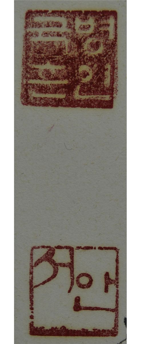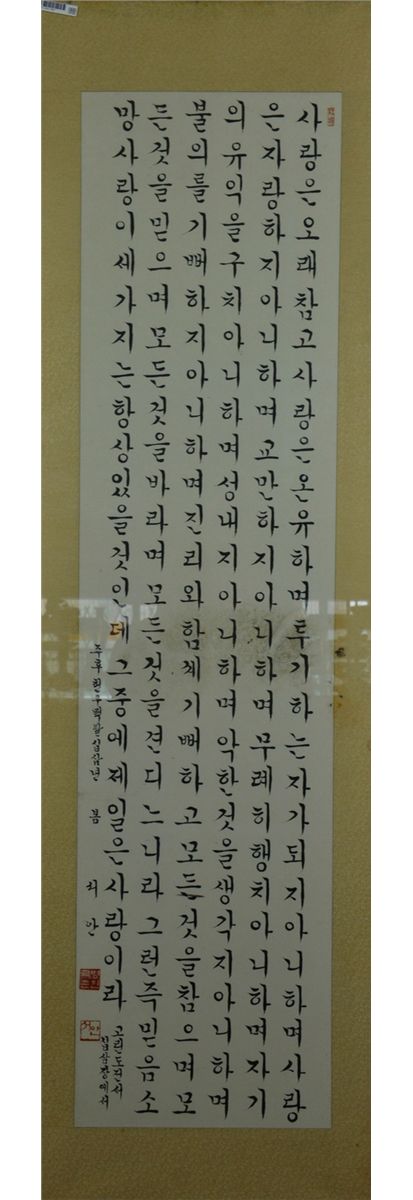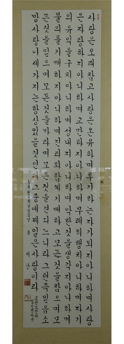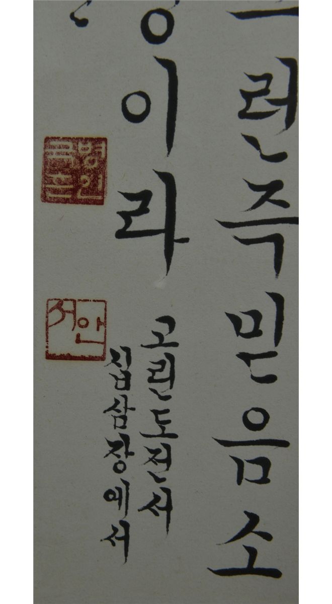 Framed Korean script calligraphy, ink on paper; inscribed and signed with two seals; inscribed and signed with three seals; 128 cm x 32 cm
