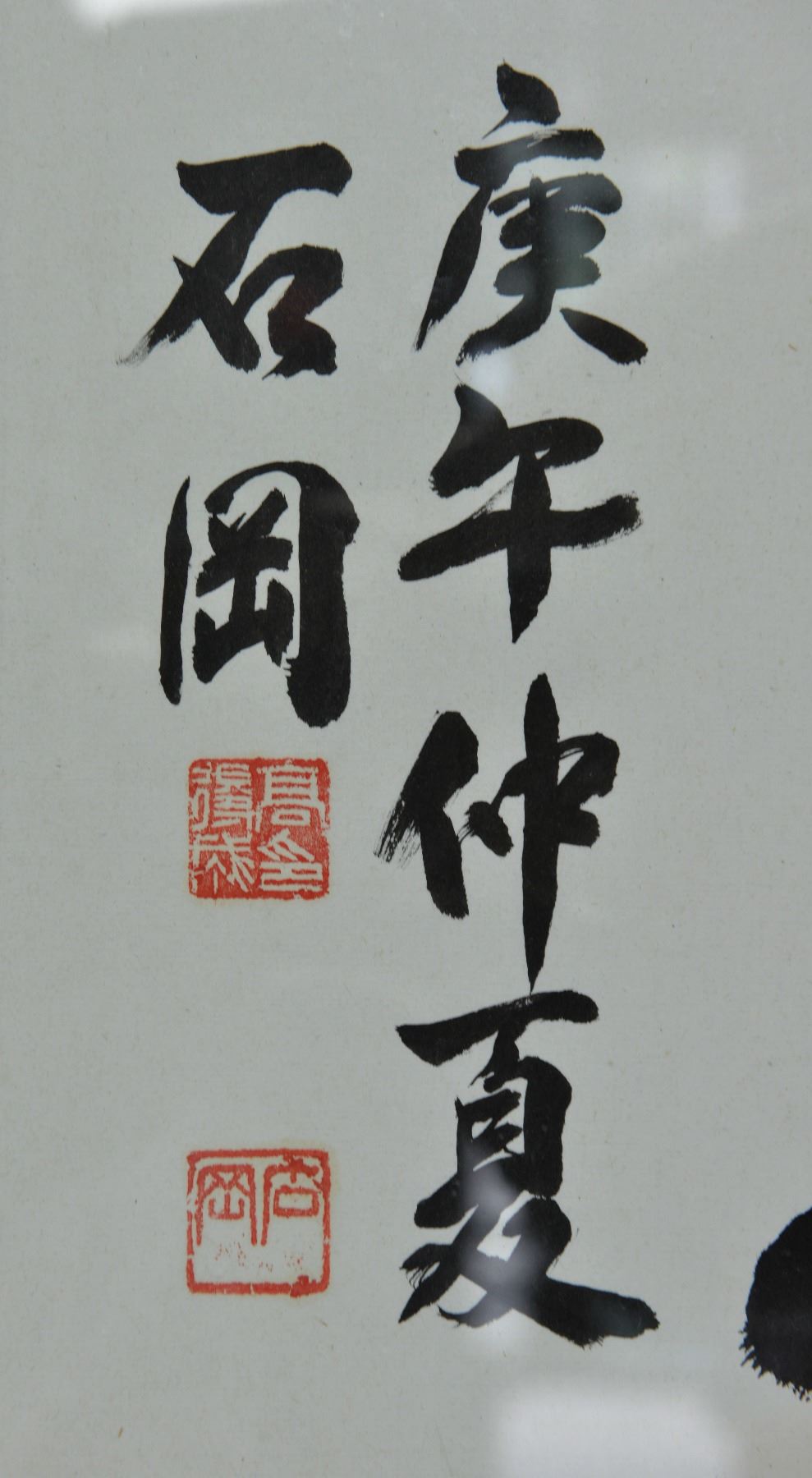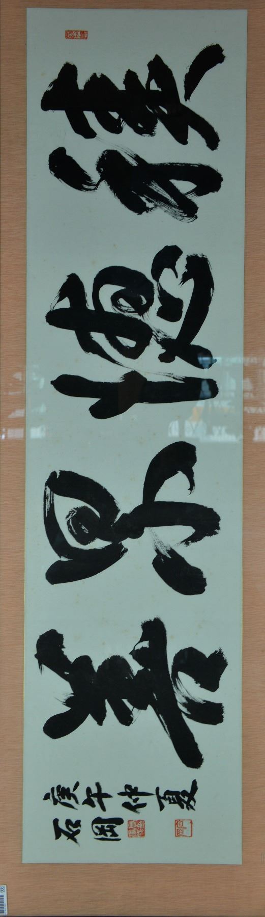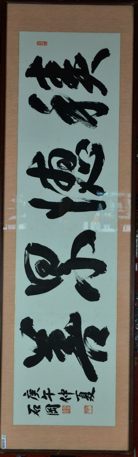 Framed Korean script calligraphy, ink on paper; inscribed and signed with two seals; 132 cm x 34 cm