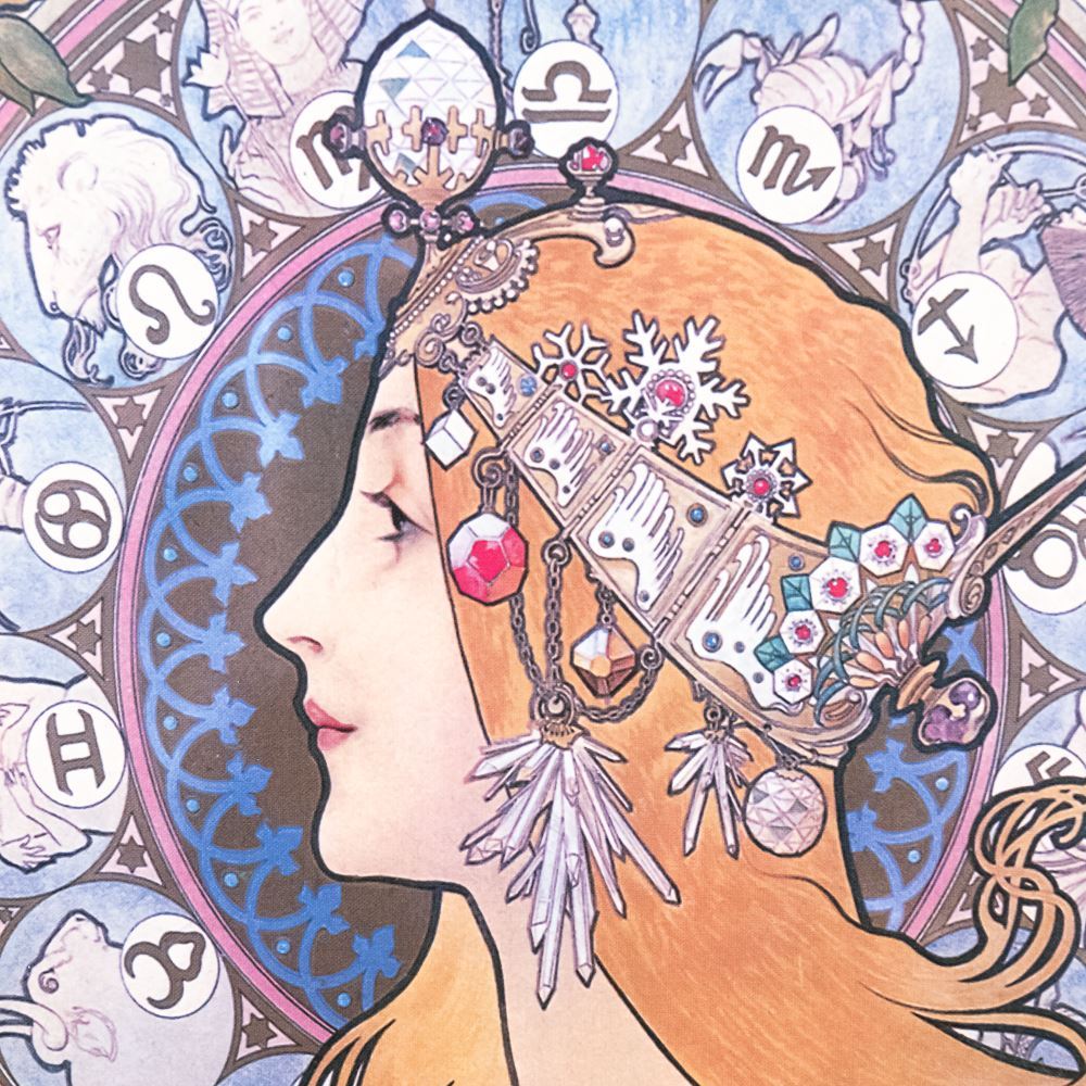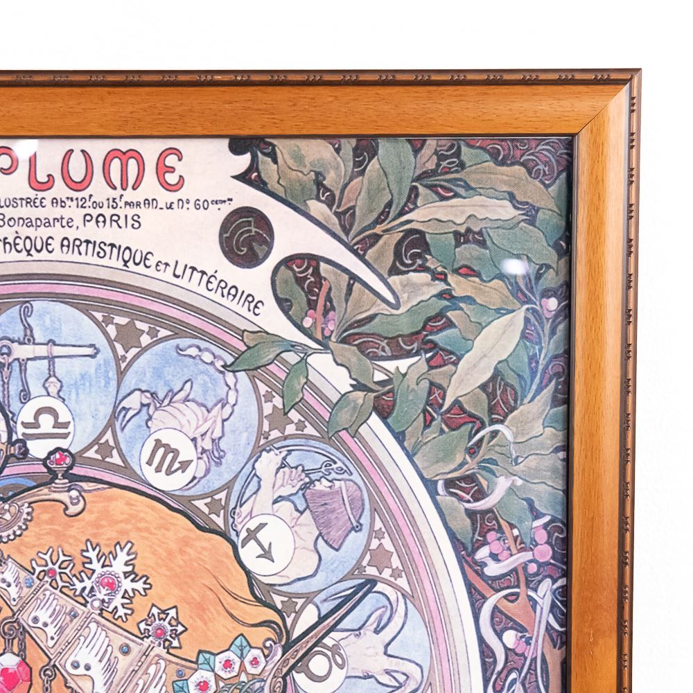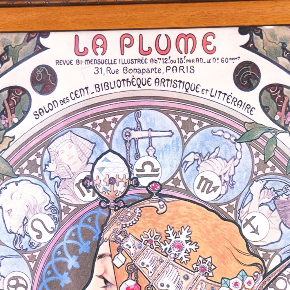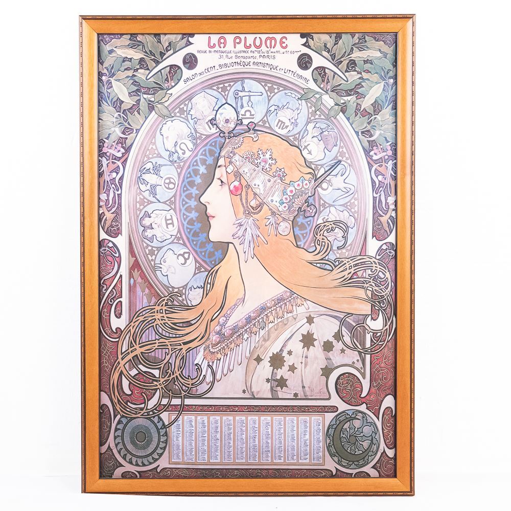 Eye catching La Plume contemporary framed canvass zodiac advertising poster. Approximately 39"t x 27"l and in excellent overall condition, noticeable under close examination. Please use photos to judge condition and bid accordingly.