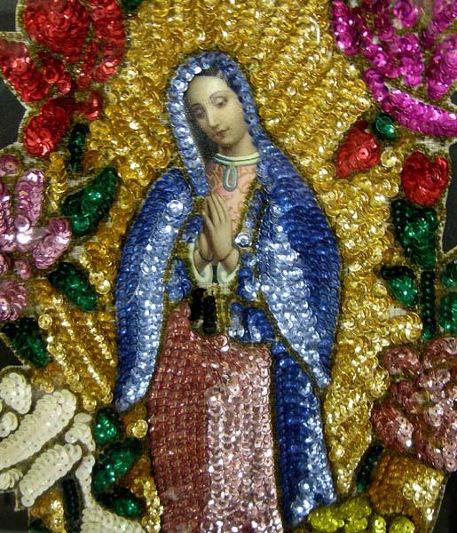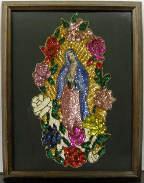 Framed Lady of Guadalupe with Sequins and Beads. Visual measures approx. 15.5''Hx11.5''W. Buyers Pay Actual Shipping and Handling Charges(see terms and conditions for more information).