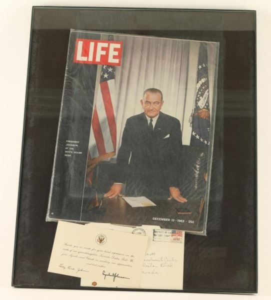 Photo of LBJ at his White House desk dated December 13, 1963 at a cost of 25¢. Also includes a thank you note concerning the birth of their granddaughter that is signed 'Lady Bird Johnson' and 'Lyndon B Johnson', also includes envelope.