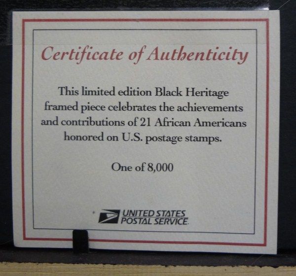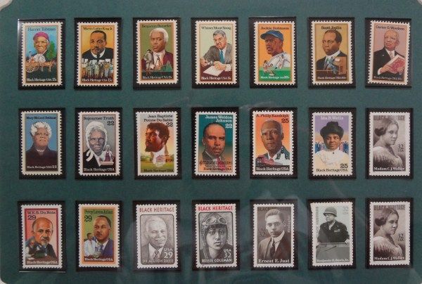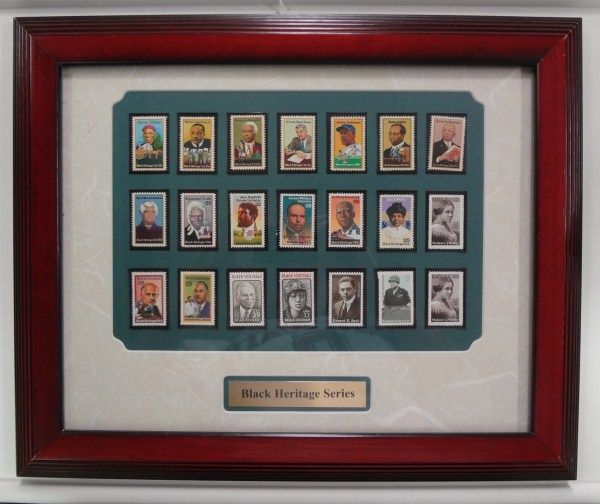 Contains 21 stamps depicting Black Heritage leaders. Names included are: Harriet Tubman, Martin Luther King, Jr., Benjamin Banneker, Whitney Moore Young, Jackie Robinson, Scott Joplin, Carter G. Woodson, Mary Mcleod Bethune, S ojourner Truth, Jean Baptiste P ointe Du Sable, James Weldon Johnson, A. P hilip Randolph, Ida B. Wells, Madam C.J. Walker, W.E,B, Du Bois, Percy Lavon Julian, Dr. Allison Davis, Bessie Coleman,Ernest E. Just, Benjamin O. Davis, Sr. This is very nicely matted and framed and the stamps are in mint condition.