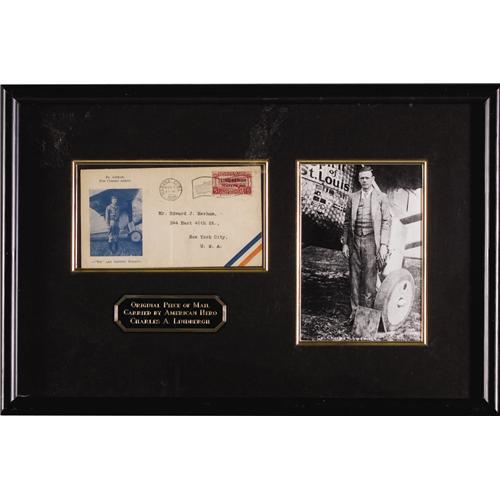 <B>Original Lindbergh Cover From His 1928 Latin American Goodwill Tour.</B></I> An attractive group consisting of a Lindbergh pictorial cover with a Havana, Cuba February 4, 1928 postmark, Lindbergh cancellation stamp, and a 4.5" x 6.5" photo of Lindbergh standing next to his famous aircraft, The Spirit of St. Louis. The group is framed and matted under glass to an overall size of 18" x 12".<BR><BR><b>Shipping:</b> Framed - with Glass, Medium (<a target="_blank" href="http://www.heritageauctions.com/common/shipping.php">view shipping information</a>)