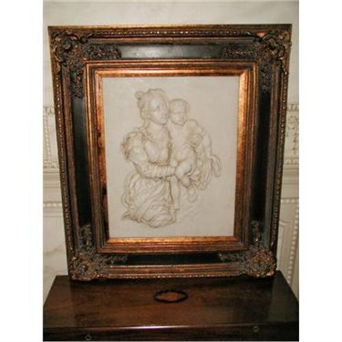 19th century gorgeous framed marble dust highly raised carving of a 19th century mother,dressed in the attire of the day holding her son. Wonderful detail to th piece,capturing each fold in her dress with ruffles as well as the faces,hands and feet. Set off by a 6 inch wide ornate black and gold frame with embellished corners. Backed in black fabric with large felt wall protectores. Excellent condition,no nicks,chips,cracks or damage to the frame. Wire on back for hanging. Measures 26.5L X 30.75H X 2.5D.