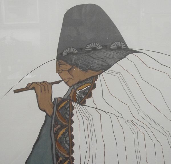 From the Collection of Nick & Suzanne Nicholas comes this Framed, Matted, Hand Signed & Numbered Pena Print. Amado Pena Jr.'s art focuses on Hispanic and Native American figures and has been described as capturing the essence of the Southwest. Pena, a mestizo of Mexican and Yaqui Indian descent, was born in 1943 and raised in Laredo, Texas. He earned B.A. and M.A. degrees at Texas A & I University in Kingsville, Texas and was an art teacher in Texas public schools for sixteen years. Numbered 56 of 65 this vividly colored piece is under glass and has a visual memory of approx. 22'' x 16.5''W.