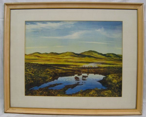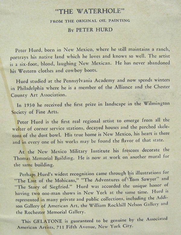 Framed & Matted Peter Hurd Print. This piece is titled "The Waterhole". It has a visual measurement of approx.16''H x 21''W.