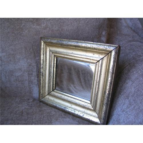 Beautiful antique framed mirror. The frame is the antique, the mirror is new as is the backing on the piece. Nice decorative mirror measuring 9 inches by 10 inches. The frame has great patina, once painted gold, now distressed and aged to perfection.