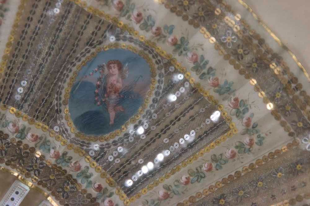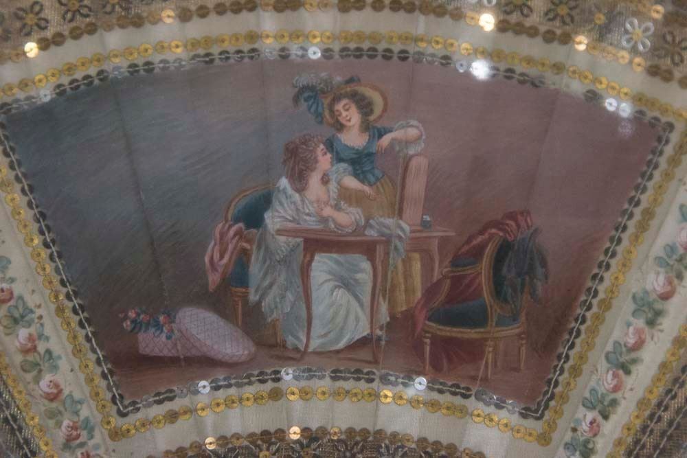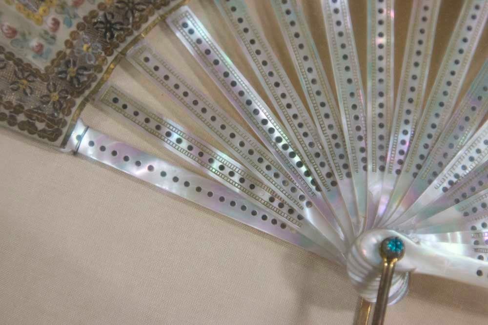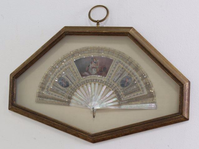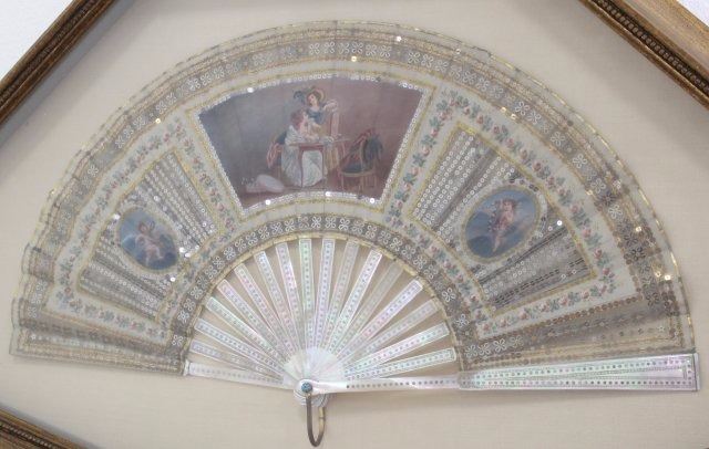Pain decorated framed fan with mother of pearl handle. Fan- approx. 15 3/4" wide by 8" high. Frame - approx. 23 3/4" wide, 15 1/4" high. Good condition Good condition.