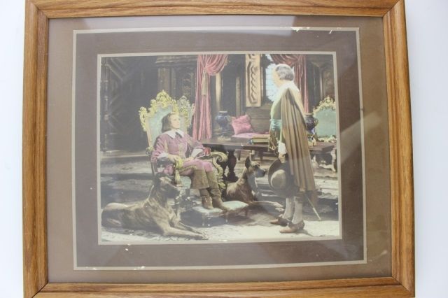 Framed color movie photo. Features unknown actor, Greta Garbo as Queen Christina and two Great Dane dogs.