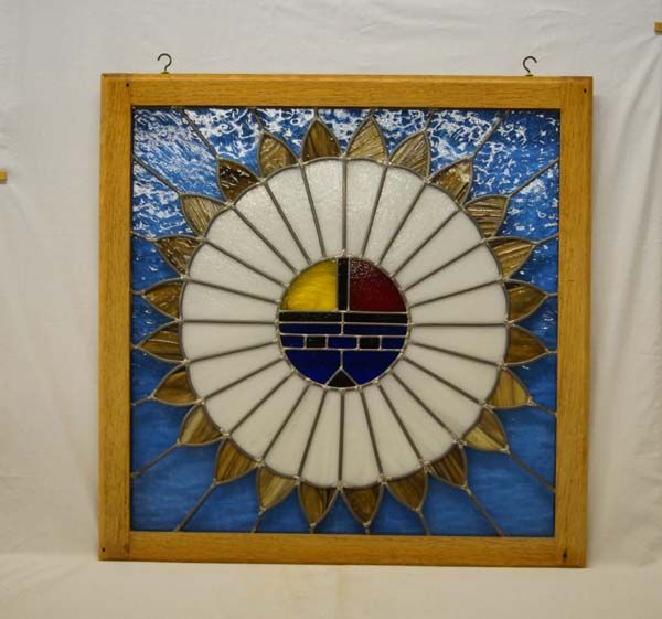 Framed Native American Sun God Stained Glass Art, measures 20'' x 20''