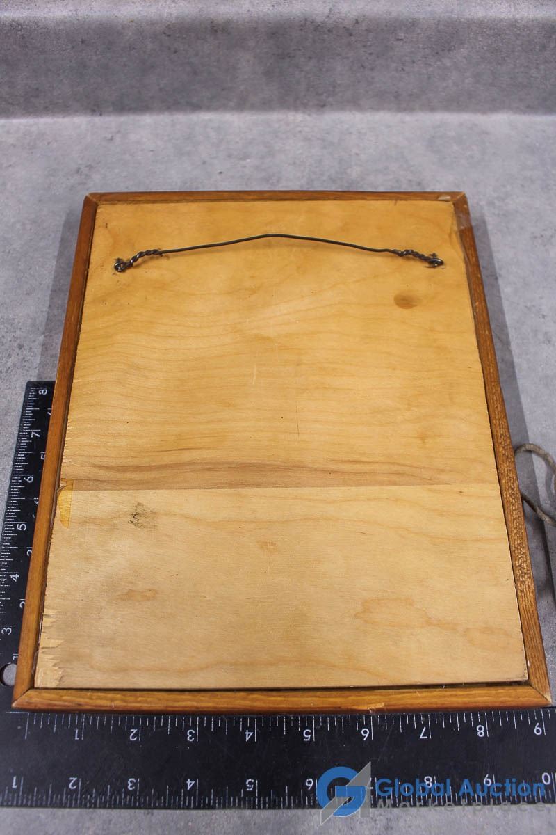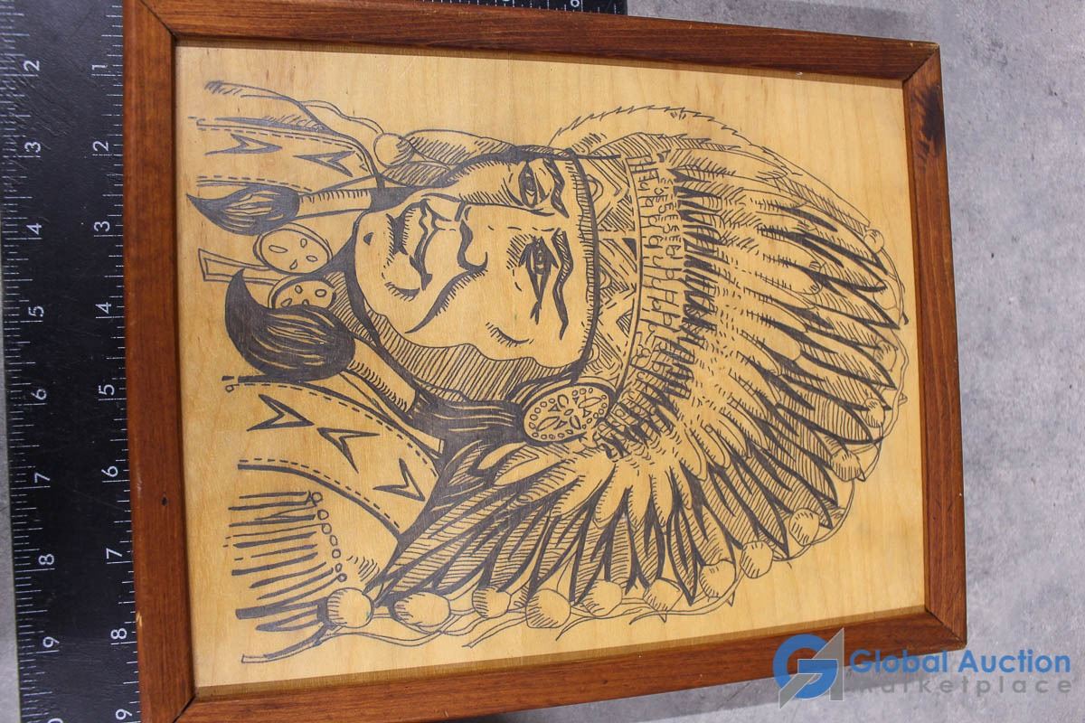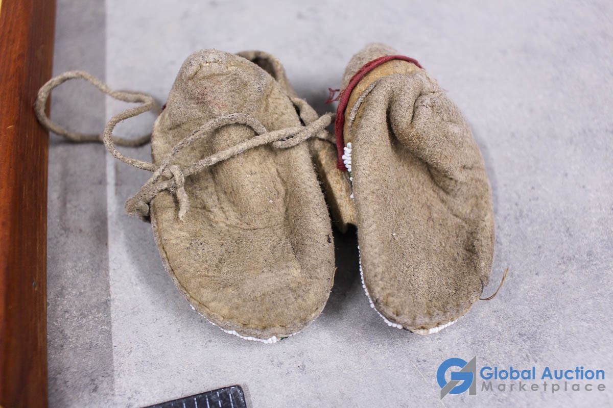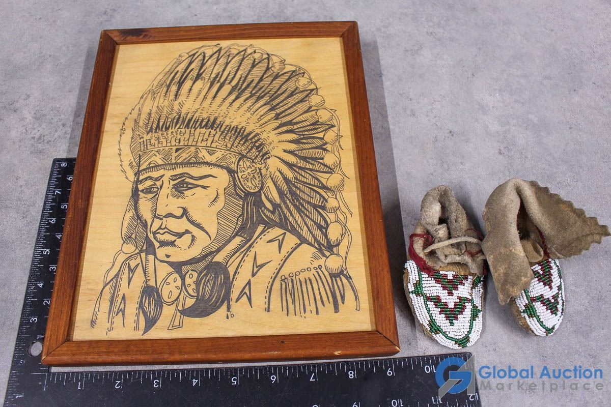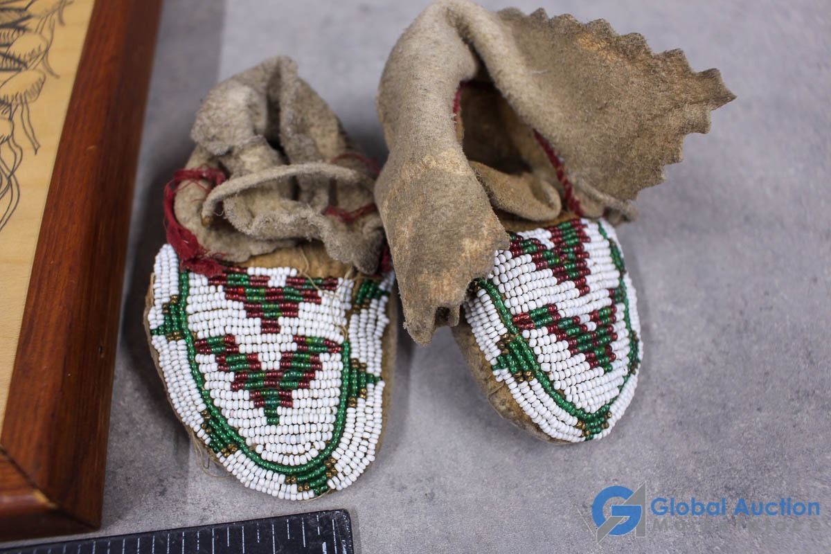 Framed Native Indigenous Drawing (on wood) & Pair of Beaded Moccasins (baby size)