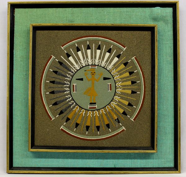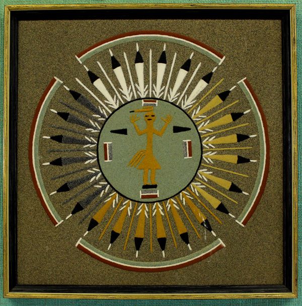 Framed Navajo Kachina Banner Sand Painting, measures approx. 17'' x 17''.