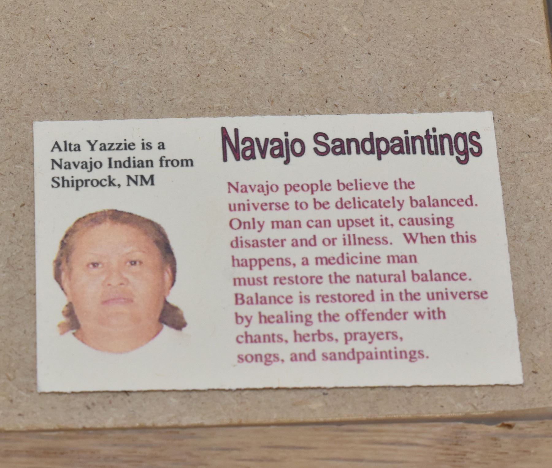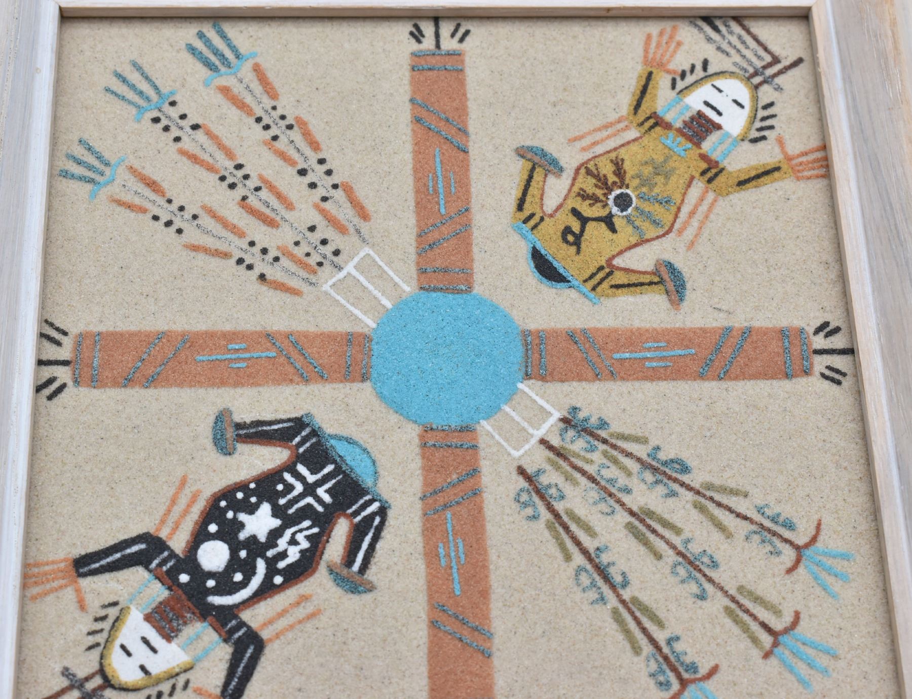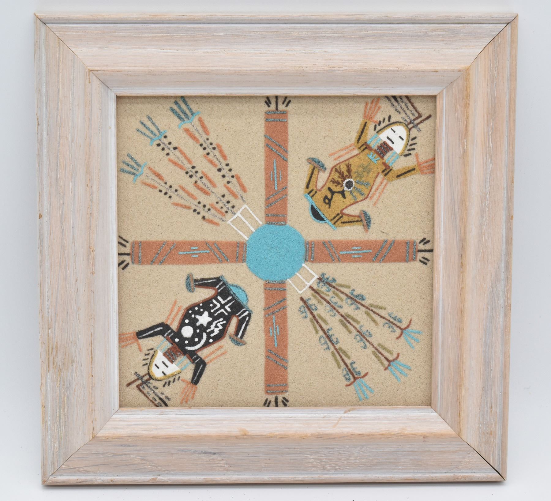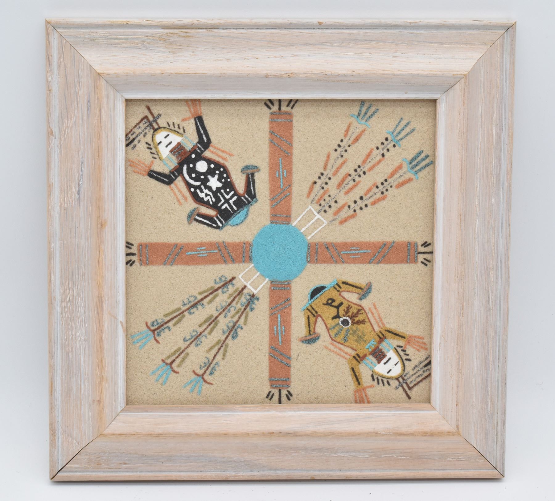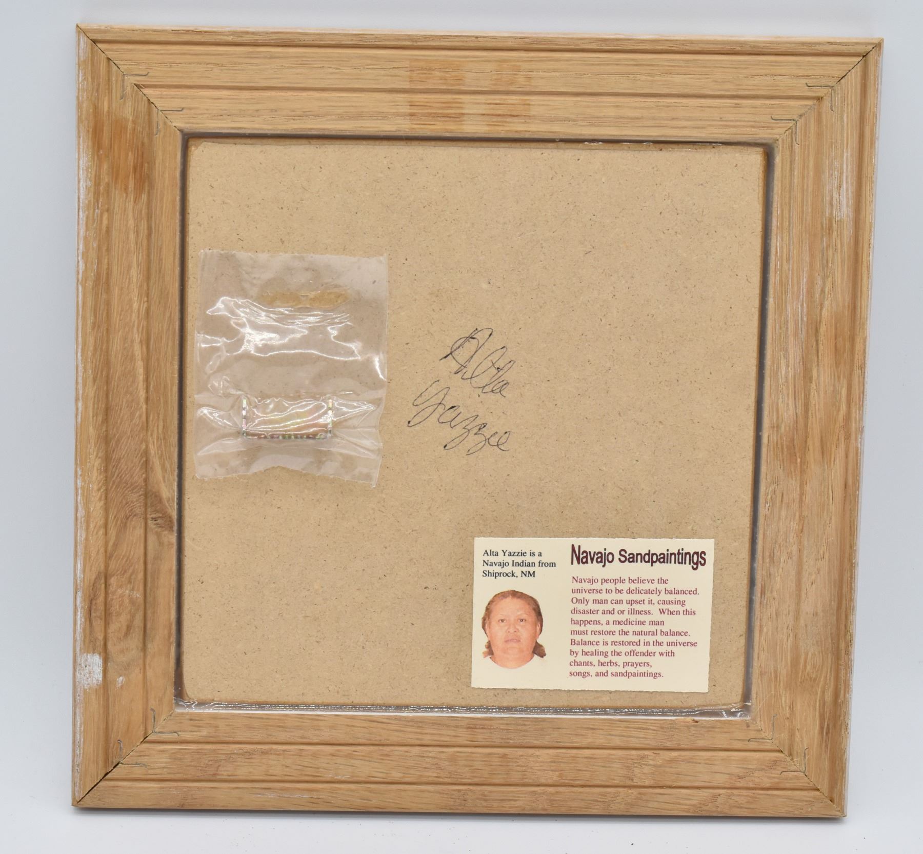 Framed Native American Navajo Directional Sand Painting by Alta Yazzie of Shiprock NM, measures 8.25'' square and is signed on the back, comes with informational card on the back