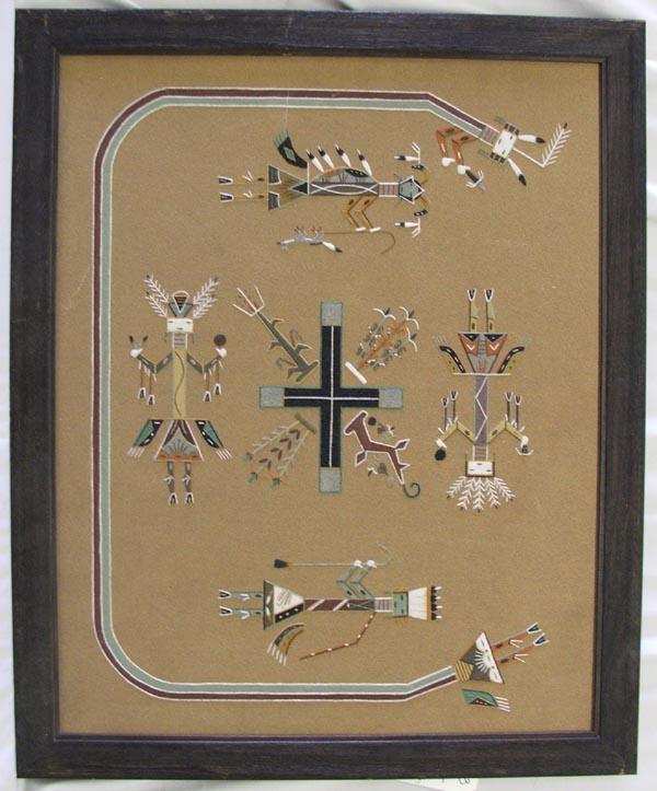 Framed Navajo Sand painting by Harry E. Yabeny, written on back ''Whirling Log This design of sand painting is used in the sacred curing ceremonial by the Navajo Medicine Men for healing of a sick patient. Sand is natural color by Harry E. Yabeny Box 938 Shiprock, N. Mexico 87420 12-29-1975'',measures approx. 23.25'' x 29.5''. SHI $75.