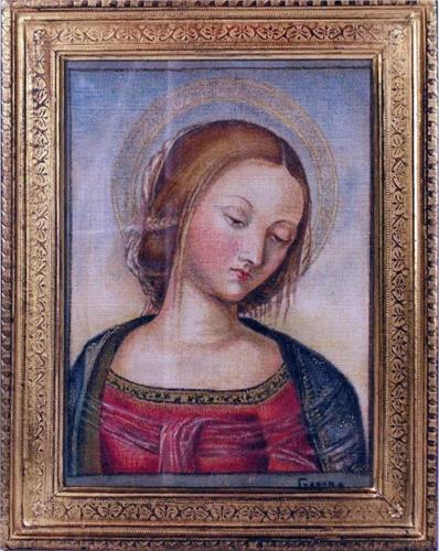 Framed needlepoint of the Madonna, bust only, /s/ l.r., no date. 13" by 4 1/2"