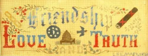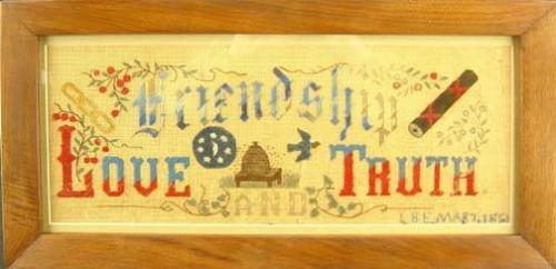 Framed Needlepoint, "Friendship, Love and Truth", 1861, sight size 18.75" x 7.5"